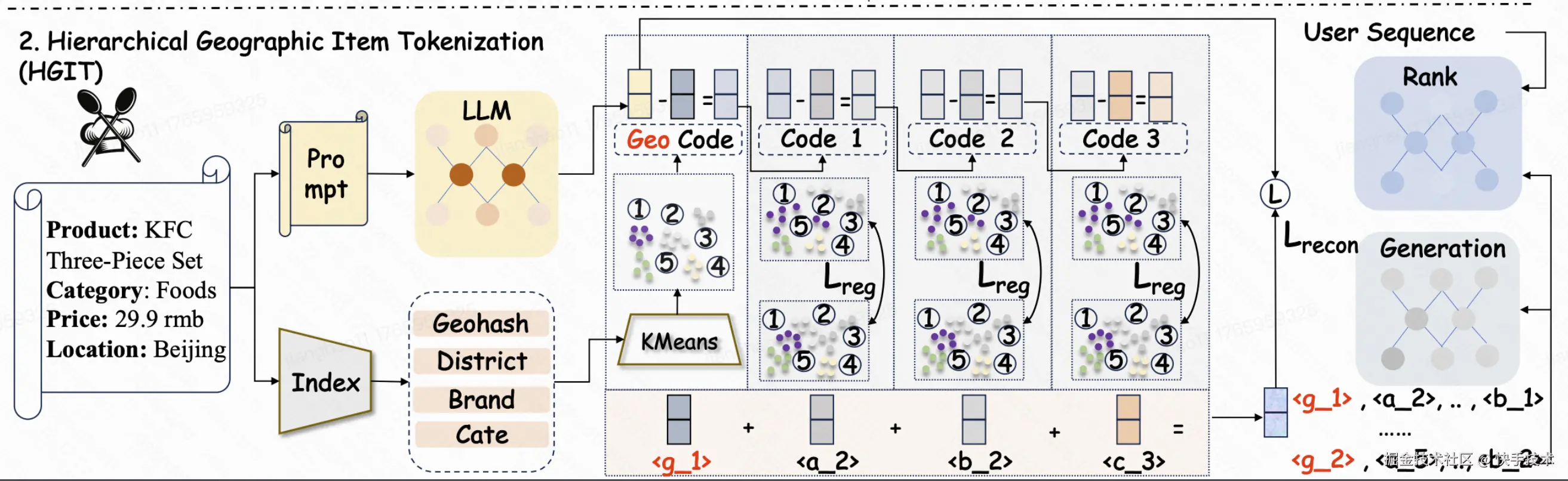 【帮助推荐模型更好适配近场分发】针对现有单一表征量化无法层次化建模的问题,本文创新性地提出了地理感知层次化量化的方案—HGIT。量化 ID 的首层通过“硬”的离散化地理位置(GeoHash,经纬度)生成初始化聚类,其余层则使用具有地理位置感知能力的内容表征逐层残差量化。