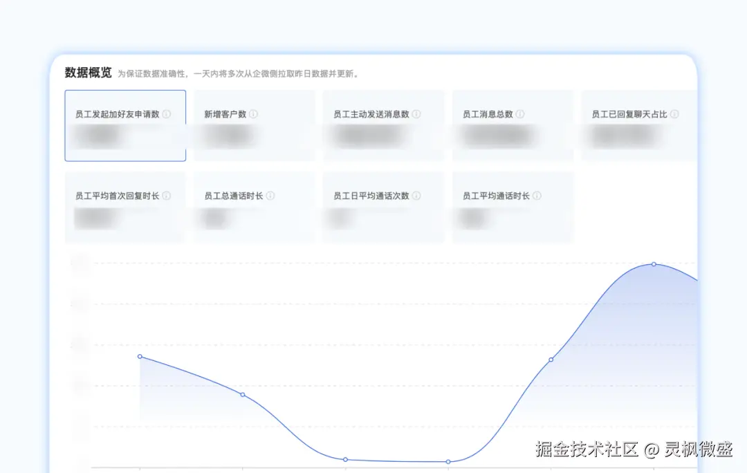 ◎ 解决办法:在接入微盛·会话存档「会话存档」后,企业不用开发复杂的数据分析系统,就能通过「会话数据统计」功能,直接在后台看到员工的活跃客户数、员工会话数等聊天数据统计,以此来精准判断企业客户的活跃度、员工的工作情况。
