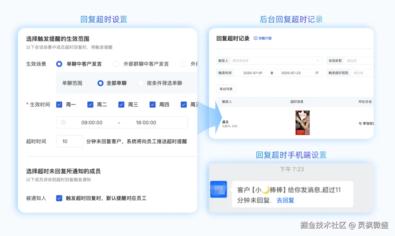 ◎ 解决办法:微盛·会话存档的「超时回复预警」功能,能帮你实时扫描1V1和群对话信息,识别客户需求、咨询、投诉信息等,一旦员工未在设定好的时间内回复,就会立即触发提醒,通知到对应员工或管理人员,督促员工立刻回复。