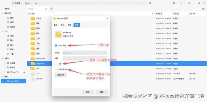 设置共享权限,开启该文件夹的共享功能,设置是否只读以及匿名登录访问。