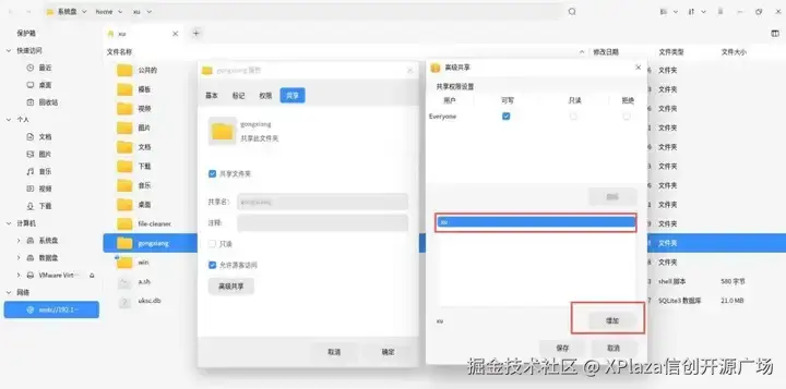 如需配置访问共享文件夹的用户名和密码,点击“高级共享”按钮,选择本机用户,点击添加用户,并配置该用户的读写权限。如需提示授权操作,请输入系统开机密码即可。