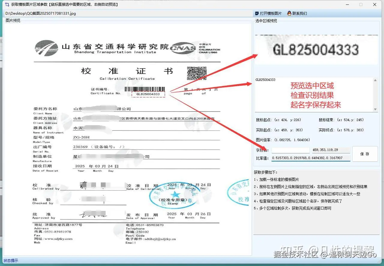 a. 把“样本文件”拖进预览区;b. 用“矩形工具”框选需要识别的区域,例如发票的“发票代码”、“金额”、“日期”三处;c. 每框完一次点“保存区域”,系统会提示给区域命名(此名字即Excel列名),同时把坐标写入ini模板;d. 支持“多页PDF只采第一页”或“每页都采”,在设置里勾选即可。