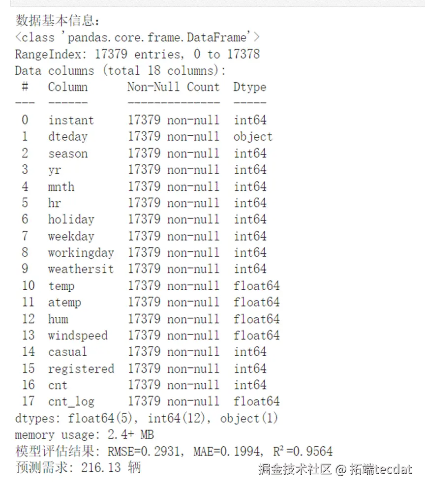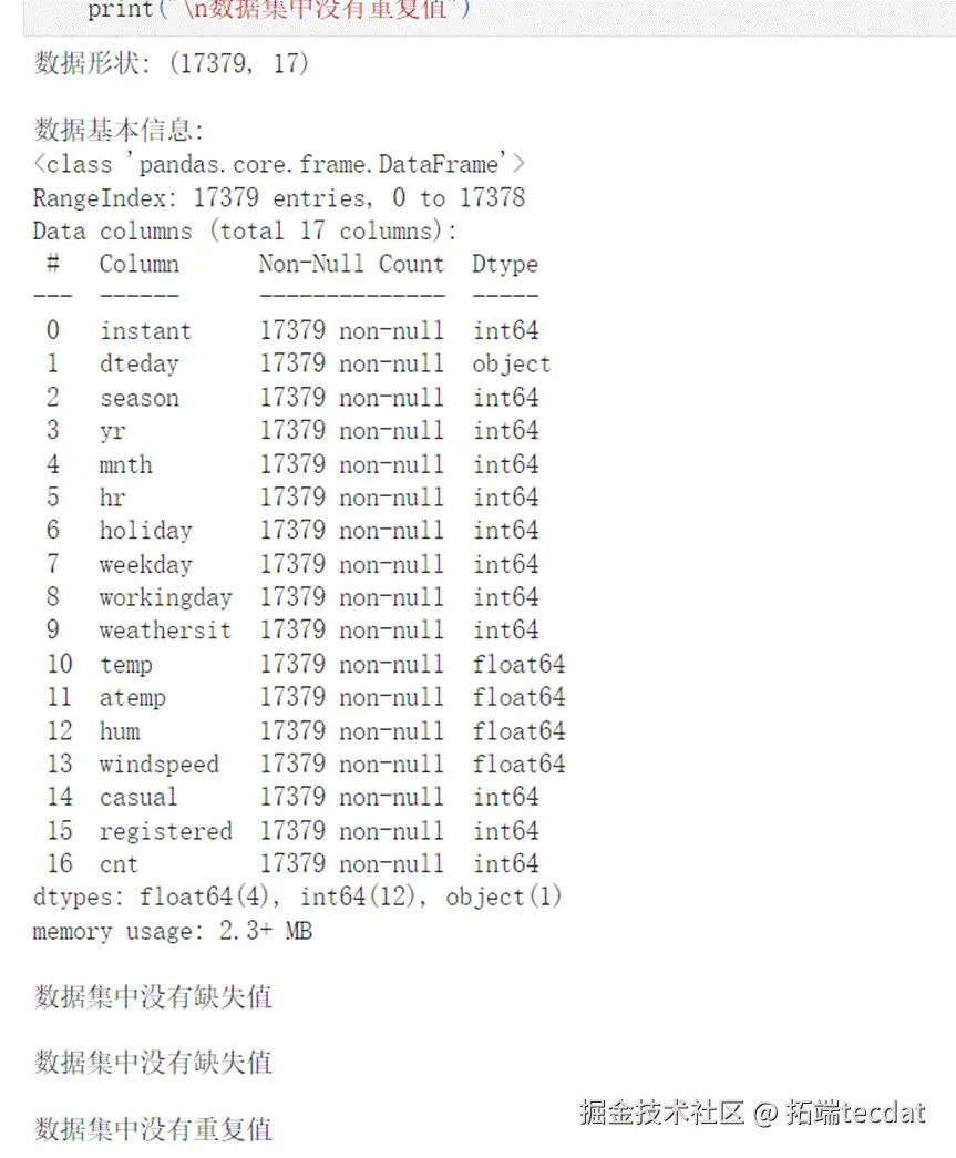 运行上述代码后,可得到数据集的基础信息:该数据集包含17379条记录、17个字段,涵盖时间特征(season、yr、mnth、hr等)、天气特征(weathersit、temp、hum等)、出行需求特征(casual、registered、cnt)等核心维度,且无缺失值与重复值,为后续分析奠定了良好基础。