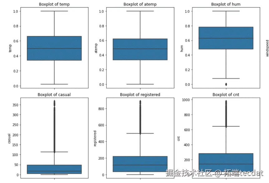 from scipy import stats# 检查重复值并处理duplicate_count = bike_data.duplicated().sum()if duplicate_count > 0: print(f"\n数据集中有{duplicate_count}行重复数据,已删除") bike_data = bike_data.drop_duplicates()else: print("\n数据集中无重复值")# 定义数值型特征列表,用于异常值检测numeric_features = ['temp', 'atemp', 'hum', 'windspeed', 'casual', 'registered', 'cnt']# 可视化箱线图识别异常值(省略绘图代码)......# 使用Z-score方法处理异常值,阈值设为3z_scores = np.abs(stats.zscore(bike_data[numeric_features]))bike_data_clean = bike_data[(z_scores < 3).all(axis=1)]print(f"处理异常值前数据量:{bike_data.shape[0]}")print(f"处理异常值后数据量:{bike_data_clean.shape[0]}")print(f"删除异常值数量:{bike_data.shape[0] - bike_data_clean.shape[0]}")# 对温度、湿度、风速进行标准化处理scaler = StandardScaler()bike_data_clean[['temp', 'atemp', 'hum', 'windspeed']] = scaler.fit_transform( bike_data_clean[['temp', 'atemp', 'hum', 'windspeed']])# 对计数型特征进行对数转换,使分布更接近正态分布bike_data_clean[['casual', 'registered', 'cnt']] = np.log1p(bike_data_clean[['casual', 'registered', 'cnt']])print("数据标准化与对数转换完成")