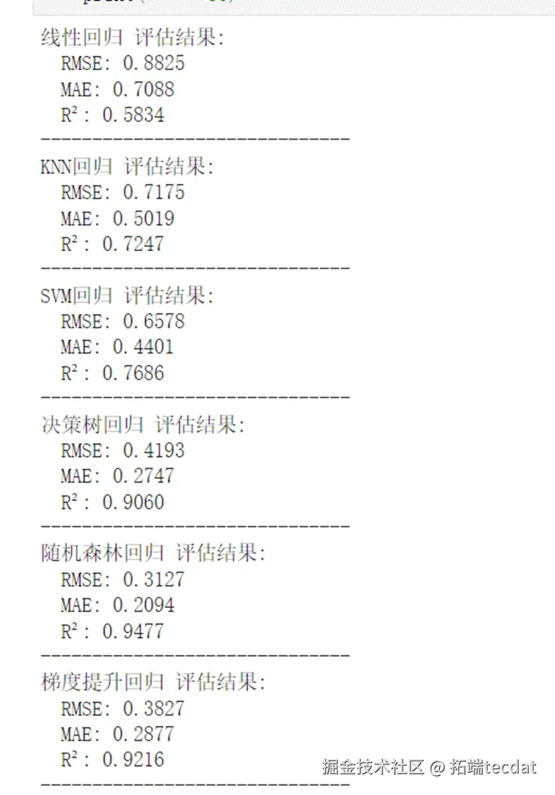 # 加载预处理后的数据processed_data = pd.read_csv('hour_preprocessed.csv')# 特征选择:排除非预测性特征X = processed_data.drop(['instant', 'dteday', 'casual', 'registered', 'cnt', 'season_name', 'weather_name'], axis=1)y = processed_data['cnt'] # 目标变量:总租赁数量# 划分训练集和测试集,测试集占比20%X_train, X_test, y_train, y_test = train_test_split(X, y, test_size=0.2, random_state=42)# 特征标准化(用于KNN、SVM模型)scaler = StandardScaler()X_train_scaled = scaler.fit_transform(X_train)X_test_scaled = scaler.transform(X_test)# 初始化模型字典models_dict = { "线性回归": LinearRegression(), "KNN回归": KNeighborsRegressor(n_neighbors=5), "SVM回归": SVR(kernel='rbf'), "决策树回归": DecisionTreeRegressor(random_state=42), "随机森林回归": RandomForestRegressor(n_estimators=100, random_state=42), "梯度提升回归": GradientBoostingRegressor(n_estimators=100, random_state=42)}# 模型评估与结果保存(省略循环评估代码)......# 输出最优模型best_model_name = results_df['RMSE'].idxmin()print(f"\n最优模型(基于RMSE): {best_model_name}")print(f"RMSE: {results_df.loc[best_model_name, 'RMSE']:.4f}")print(f"R²: {results_df.loc[best_model_name, 'R²']:.4f}")