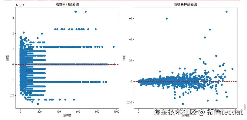 from scipy import stats# 计算线性回归和随机森林的残差linear_y_pred = linear_model.predict(X_test_scaled)linear_residuals = y_test - linear_y_predrf_y_pred = rf_model.predict(X_test)rf_residuals = y_test - rf_y_pred# 可视化残差图(省略绘图代码)......# 正态性检验(Shapiro-Wilk检验)linear_shapiro = stats.shapiro(linear_residuals)rf_shapiro = stats.shapiro(rf_residuals)print('线性回归残差正态性检验:')print(f'统计量: {linear_shapiro.statistic}, p值: {linear_shapiro.pvalue}')print('随机森林残差正态性检验:')print(f'统计量: {rf_shapiro.statistic}, p值: {rf_shapiro.pvalue}')