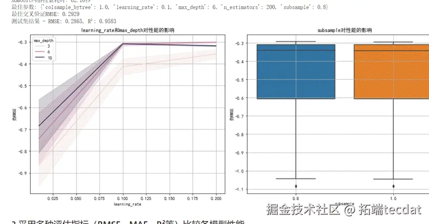 from sklearn.model_selection import GridSearchCVimport time# 随机森林参数网格rf_param_grid = { 'n_estimators': [50, 100, 200], # 决策树数量 'max_depth': [None, 10, 20, 30], # 树的最大深度 'min_samples_split': [2, 5, 10], # 分裂内部节点的最小样本数 'min_samples_leaf': [1, 2, 4], # 叶子节点的最小样本数 'max_features': ['auto', 'sqrt'] # 分割时考虑的特征数}# 网格搜索调优随机森林start_time = time.time()rf_grid_search = GridSearchCV( estimator=RandomForestRegressor(random_state=42), param_grid=rf_param_grid, cv=5, # 5折交叉验证 n_jobs=-1, # 使用所有CPU核心 scoring='neg_root_mean_squared_error', verbose=2)rf_grid_search.fit(X_train, y_train)rf_search_time = time.time() - start_timeprint(f"随机森林网格搜索耗时: {rf_search_time:.2f}秒")print(f"最佳参数: {rf_grid_search.best_params_}")print(f"最佳交叉验证RMSE: {-rf_grid_search.best_score_:.4f}")# XGBoost参数网格与调优(省略部分代码)......