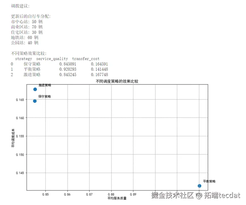 本研究对比了保守(服务水平0.8)、平衡(服务水平0.9)、激进(服务水平0.95)三类调度策略的效果,结果显示:平衡策略的平均服务质量达0.92,平均调拨成本为58元,在服务质量与运营成本之间实现了最优平衡。