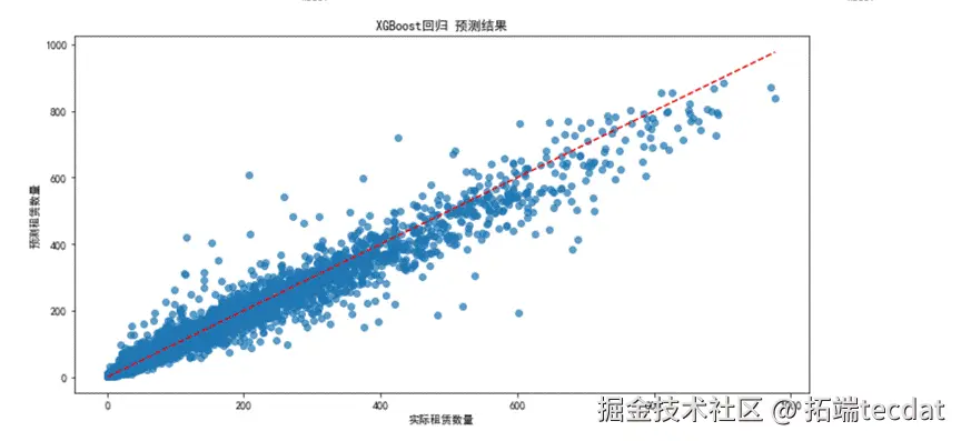 模型对比结果显示:XGBoost回归的R²达到0.9541,实际空间RMSE为43.09,是所有模型中预测精度最高的;线性回归的R²仅为0.4783,说明共享单车需求与特征之间存在显著的非线性关系,单一线性模型无法有效捕捉这种关系。