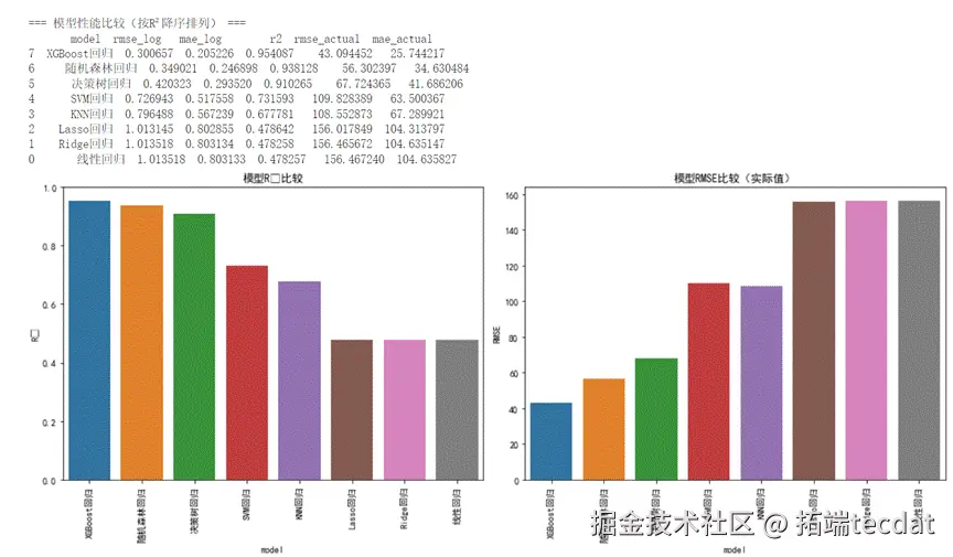 from sklearn.linear_model import LinearRegression, Ridge, Lassofrom sklearn.neighbors import KNeighborsRegressorfrom sklearn.svm import SVRfrom sklearn.tree import DecisionTreeRegressorfrom sklearn.ensemble import RandomForestRegressorfrom xgboost import XGBRegressorfrom sklearn.metrics import mean_squared_error, mean_absolute_error, r2_score# 加载预处理后的数据processed_data = pd.read_csv('hour_preprocessed.csv')# 准备特征和目标变量X = processed_data.drop(['instant', 'dteday', 'casual', 'registered', 'cnt', 'cnt_log'], axis=1)y = processed_data['cnt_log'] # 对数转换后的目标变量# 划分训练集和测试集X_train, X_test, y_train, y_test = train_test_split(X, y, test_size=0.2, random_state=42)# 标准化数据(用于线性模型、KNN、SVM)scaler = StandardScaler()X_train_scaled = scaler.fit_transform(X_train)X_test_scaled = scaler.transform(X_test)# 定义模型评估函数def evaluate_model_func(model, X_train, X_test, y_train, y_test, model_name, use_scaled=False): # 训练模型并预测 if use_scaled: model.fit(X_train_scaled, y_train) y_pred = model.predict(X_test_scaled) else: model.fit(X_train, y_train) y_pred = model.predict(X_test)# 计算对数空间的评估指标 rmse_log = np.sqrt(mean_squared_error(y_test, y_pred)) mae_log = mean_absolute_error(y_test, y_pred) r2 = r2_score(y_test, y_pred)# 转换回实际空间计算评估指标 y_pred_actual = np.expm1(y_pred) y_test_actual = np.expm1(y_test) rmse_actual = np.sqrt(mean_squared_error(y_test_actual, y_pred_actual)) mae_actual = mean_absolute_error(y_test_actual, y_pred_actual)print(f"{model_name} 评估结果:") print(f" 对数空间: RMSE={rmse_log:.4f}, MAE={mae_log:.4f}, R²={r2:.4f}") print(f" 实际空间: RMSE={rmse_actual:.2f}, MAE={mae_actual:.2f}") return {'rmse_log': rmse_log, 'r2': r2, 'rmse_actual': rmse_actual}# 模型训练与评估(省略部分模型的训练代码)......# 输出模型性能排序results_df_sorted = results_df.sort_values(by='r2', ascending=False)print("\n模型性能对比(按R²降序):")print(results_df_sorted[['model', 'rmse_log', 'r2', 'rmse_actual']])