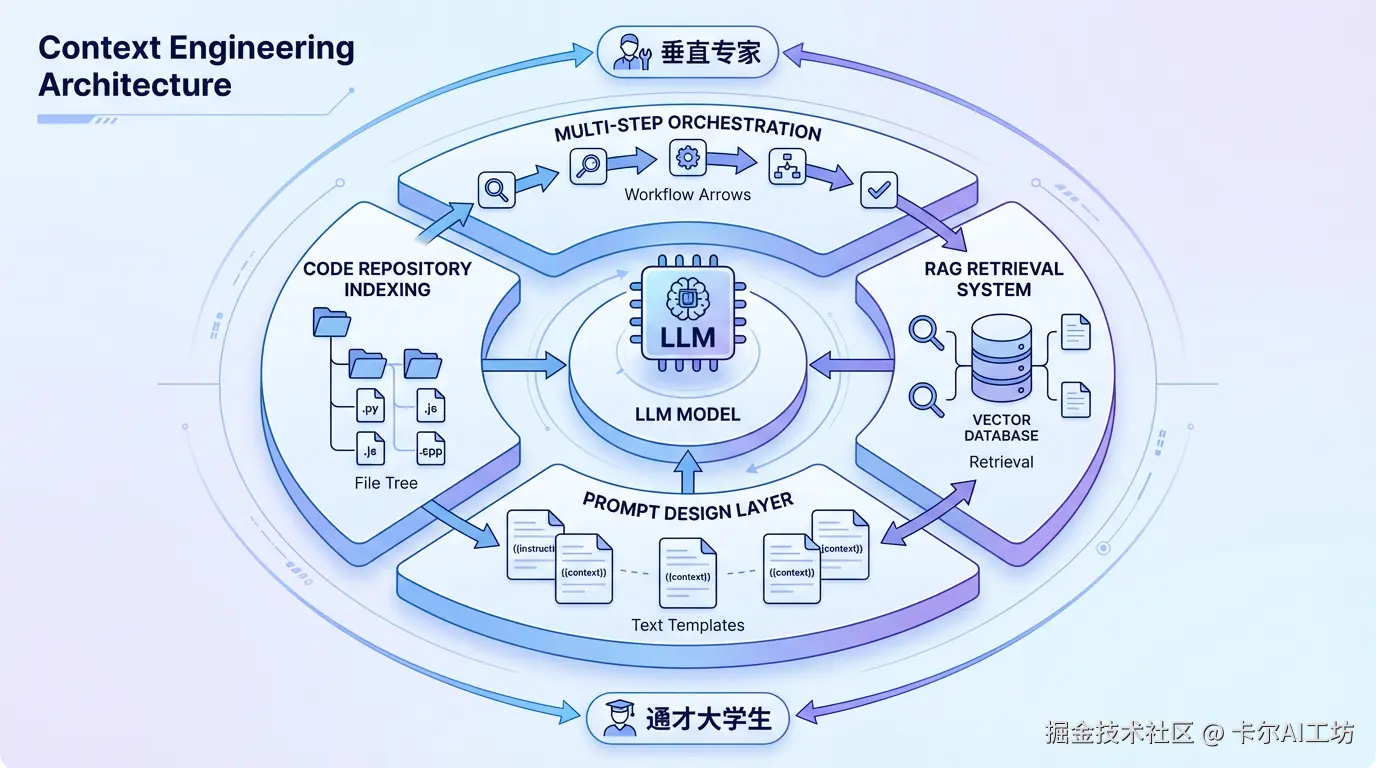 Karpathy的观点是:LLM实验室培养"通才大学生",应用层把他们培养成"垂直专家" 。桥梁就是上下文工程。