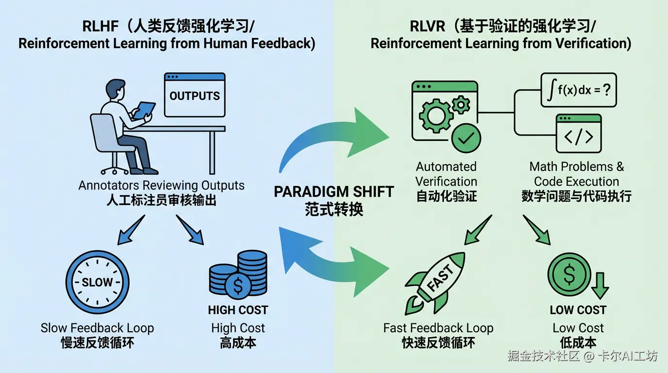打个比方:RLHF像请老师批改作文,标准不一;RLVR像做数学卷子,对就是对、错就是错。
