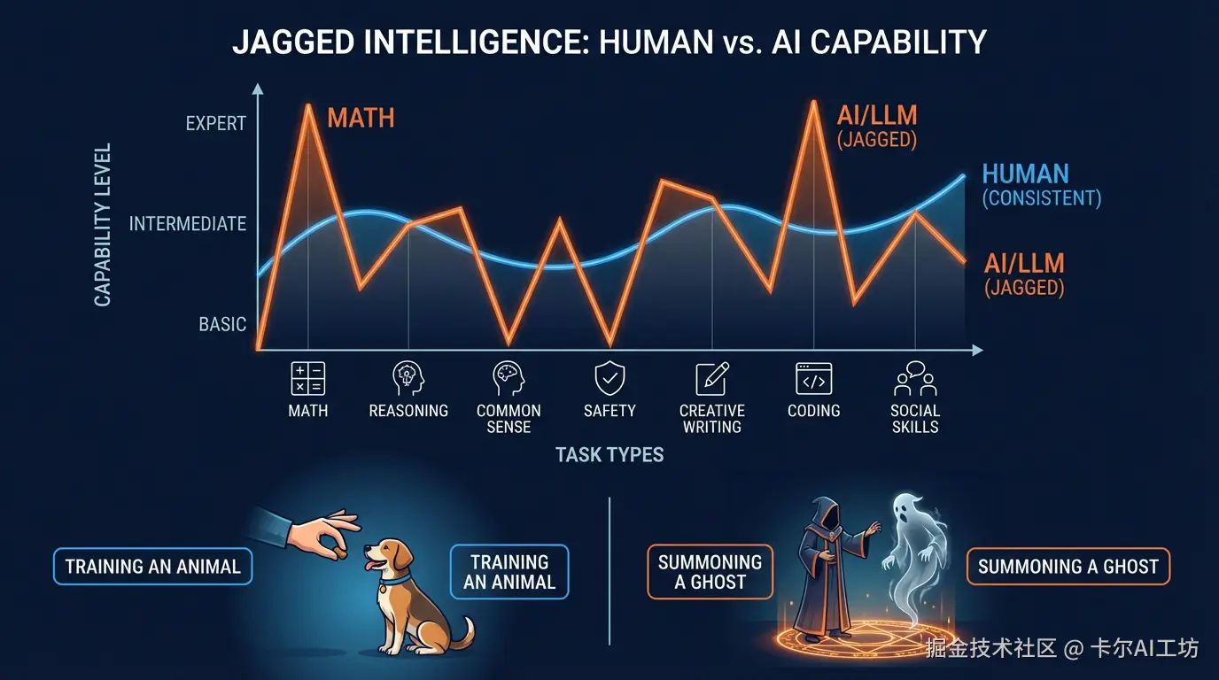 Karpathy用了一个隐喻:我们不是在"培育动物",而是在"召唤幽灵" 。
