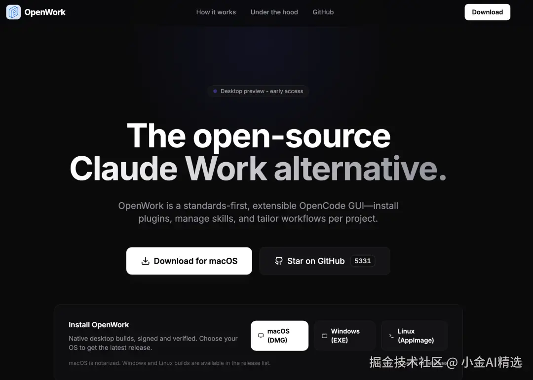 OpenWork 是一个可扩展、开源的 Claude Work 风格桌面应用: 它在桌面端把 OpenCode 的能力组织成清晰的工作流——选择 workspace,启动 run,实时查看执行与计划更新,需要时处理权限请求,并把高频流程沉淀为模板与技能。