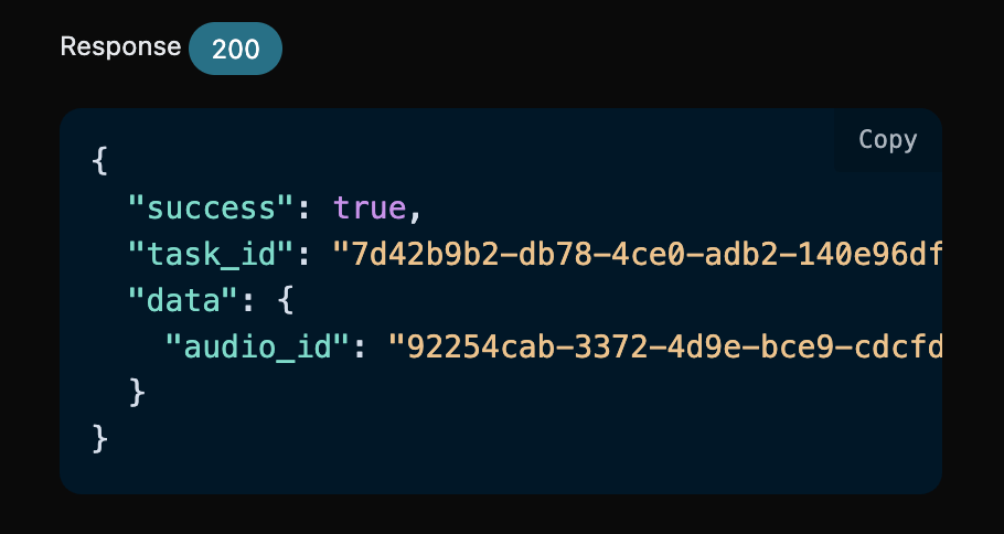 整体流程是:客户端发起请求的时候,额外指定一个 callback_url 字段,客户端发起 API 请求之后,API 会立马返回一个结果,包含一个 task_id 的字段信息,代表当前的任务 ID。当任务完成之后,生成音乐的结果会通过 POST JSON 的形式发送到客户端指定的 callback_url,其中也包括了 task_id 字段,这样任务结果就可以通过 ID 关联起来了。