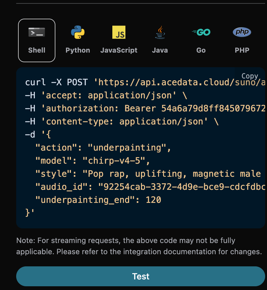 要使用 Suno Audios API,首先可以到 Suno Audios Generation API platform.acedata.cloud/documents/s… 页面点击「Acquire」按钮,获取请求所需要的凭证: