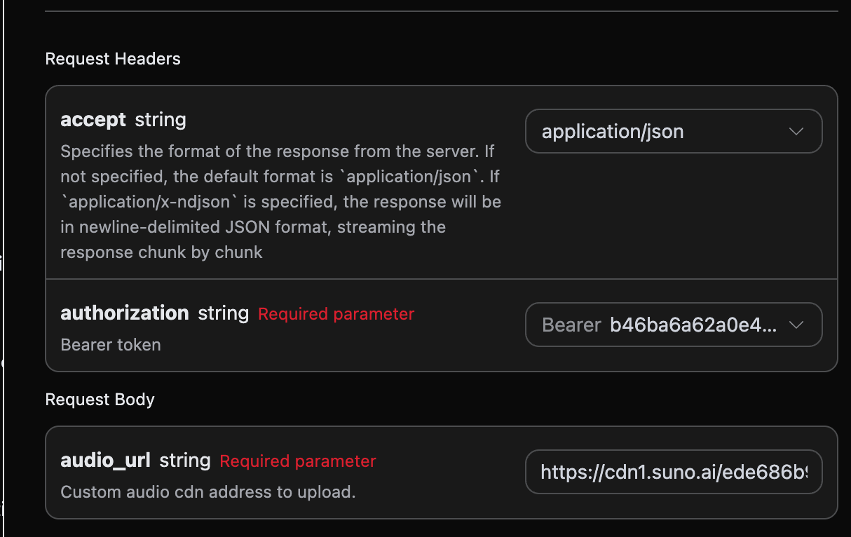 2025 年 8 月份 suno 新出 Add Vocals功能,首先需要上传一首纯音乐,让 suno 填词、出人声歌唱,首先可以先到 Suno Upload API上传一首清唱无配乐的歌曲,对应如下如的操作如下图所示: