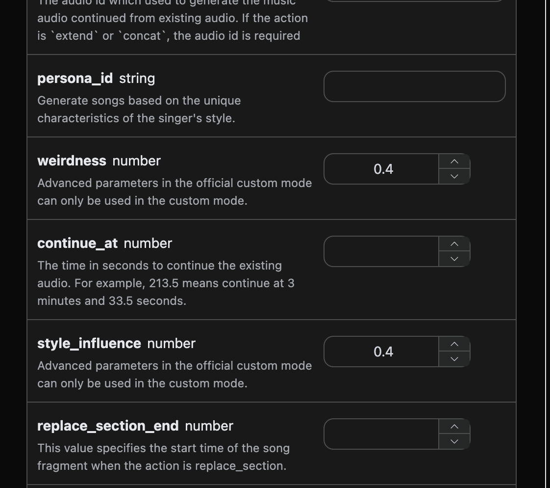 action:此次音乐生成任务的行为,默认是generate,主要包含:extend、upload_extend、cover、upload_cover、replace_section、replace_section、concat、stems、all_stems。prompt:Suno官方的灵感模式的提示词。model:此次音乐生成任务的模型,默认是chirp-v3-5,主要包含:chirp-v3、chirp-v4、chirp-v3-5、chirp-v4-5、chirp-v4-5-plus。lyric:Suno官方的自定义模式的歌词内容。custom:是否采用自定义模式,默认是:false。instrumental:Suno官方的灵感模式的纯音乐选项。title:Suno官方的自定义模式的音乐标题。style:Suno官方的自定义模式的音乐风格。style_negative:Suno官方的自定义模式的排除风格。audio_id:参考音乐的ID。persona_id:艺术家的歌曲ID。weirdness:weirdness高级参数。continue_at:以秒为单位继续现有音频的时间。例如,213.5表示继续到3分33.5秒。style_influence:style_influence高级参数。replace_section_end:替换片段的最终时间。replace_section_start:替换片段的起始时间。callback_url:需要回调结果的URL。