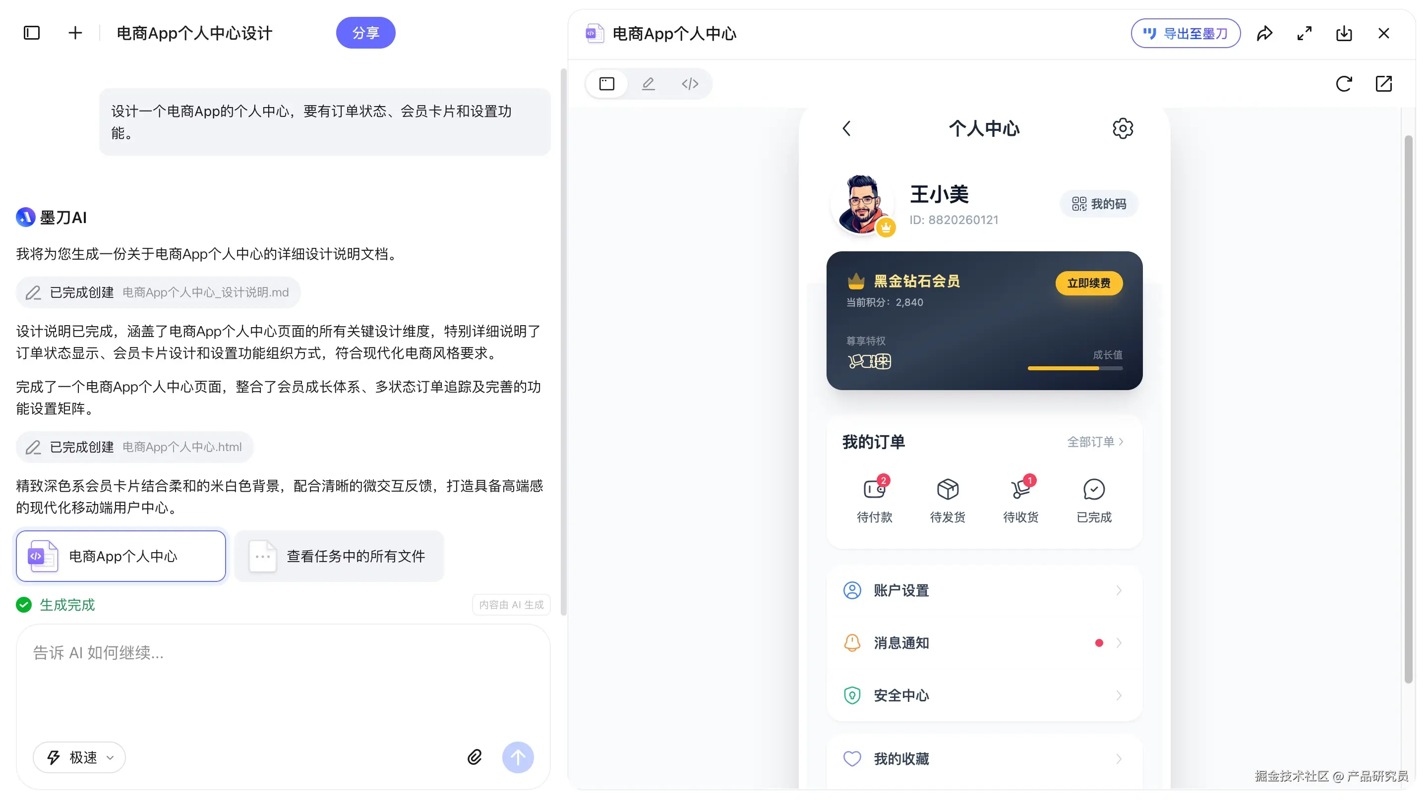 以前的画原型流程是:想清楚-画线框-调布局-标注;现在很AI原型工具,走的是另一条路:说清楚-直接生成-编辑调整。比如我最近用的比较顺手的AI原型设计工具,你不需要先去想要用什么组件,你直接告诉它:“设计一个电商App的个人中心,要有订单状态、会员卡片和设置功能。”