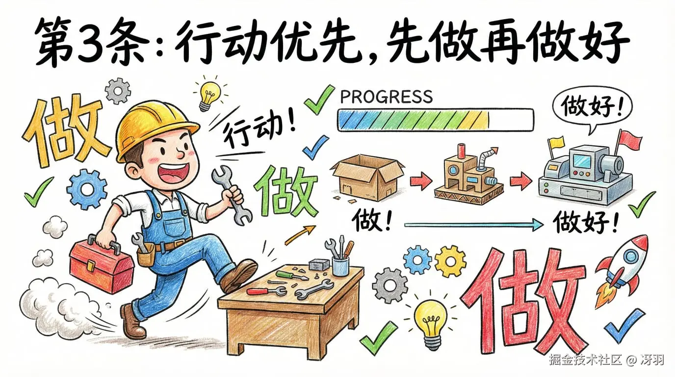 把丑陋的原型放到用户面前,写出乱糟糟的技术文档初稿,发布那个让你有点尴尬的 MVP。