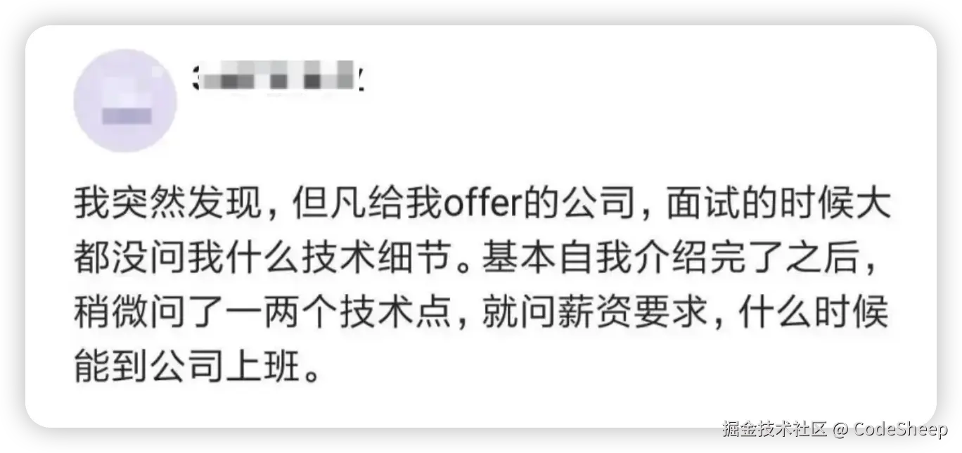 “我发现凡是给 offer 的公司,面试时基本不问技术细节,那些问得又多又细的公司,后面基本就没下文了……”