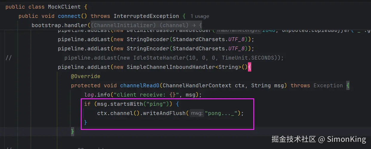 这里的场景服务端用于发送数据,所以我们可以监控写空闲来维持连接的可用性。