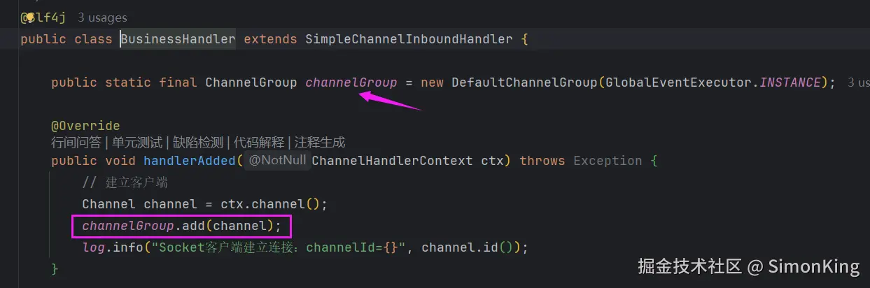 BusinessHandler.channelGroup.writeAndFlush("ping...来自服务端心跳_");