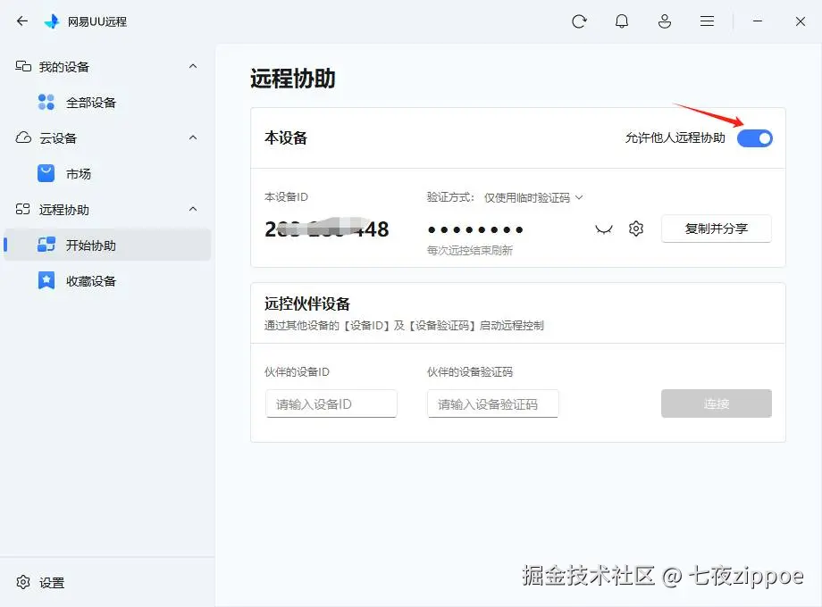 被协助方打开UU远程客户端,直接进入【远程协助】下的【开始协助】页面,首页打开允许他人远程协助开关。