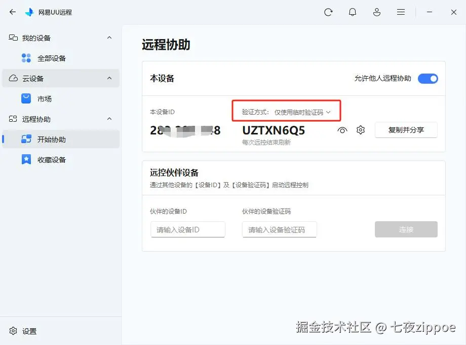 - 怎么用? 在被控端的远程协助下的”开始协助“界面中,找到“验证方式:仅使用临时验证码”这个下钻项。