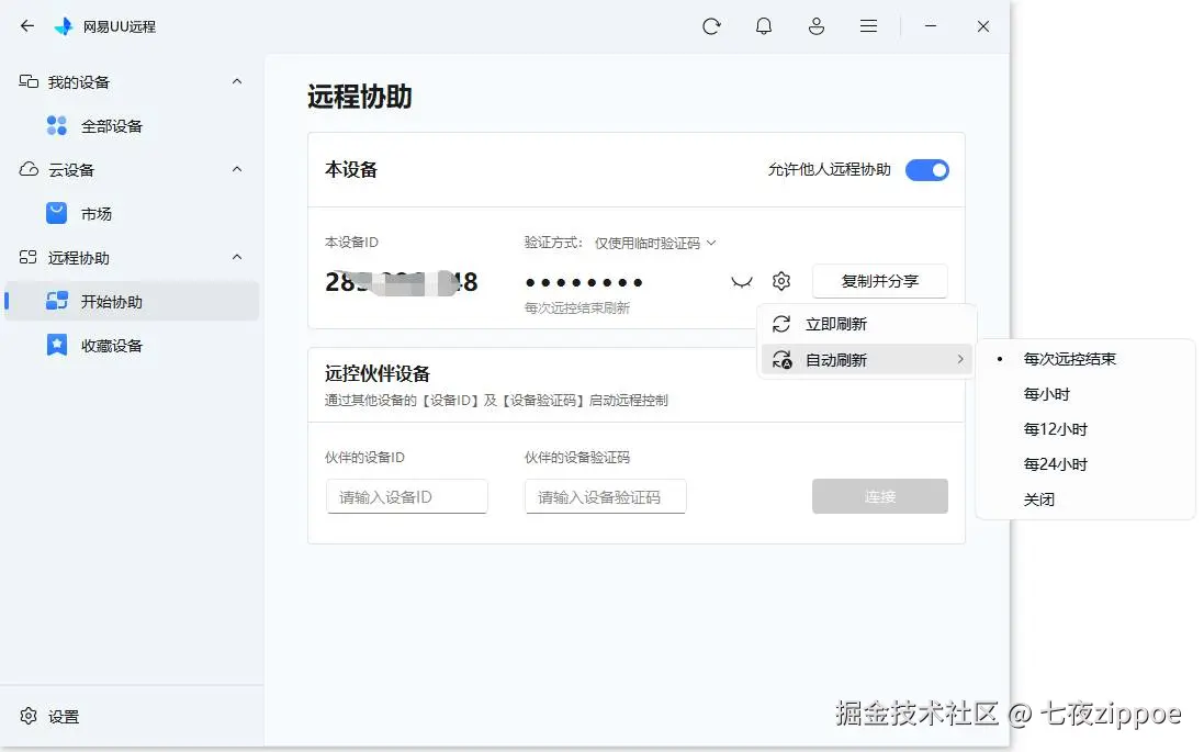 页面上会清晰显示本机的本设备ID和临时验证码。注意本设备ID是固定不变的,临时验证码是可以刷新的,刷新方式点击验证码右边的设置图标即可选择自己认为合适的方式。