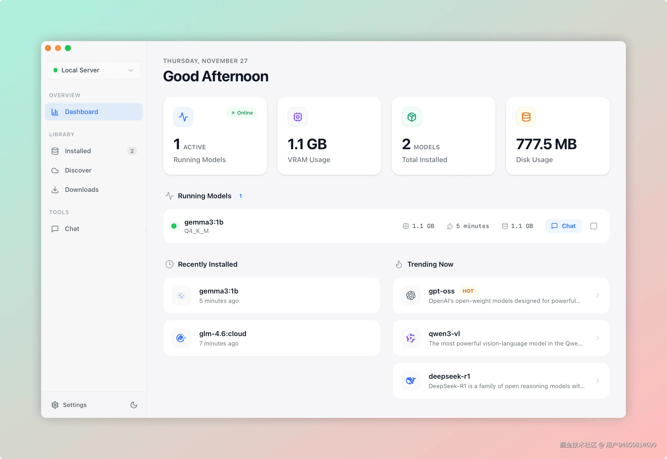 打开 OllaMan 后,它会自动检测本地的 Ollama 服务。如果一切正常,你会看到仪表盘页面。