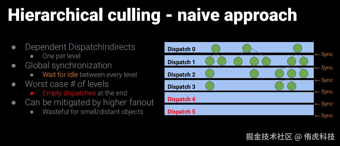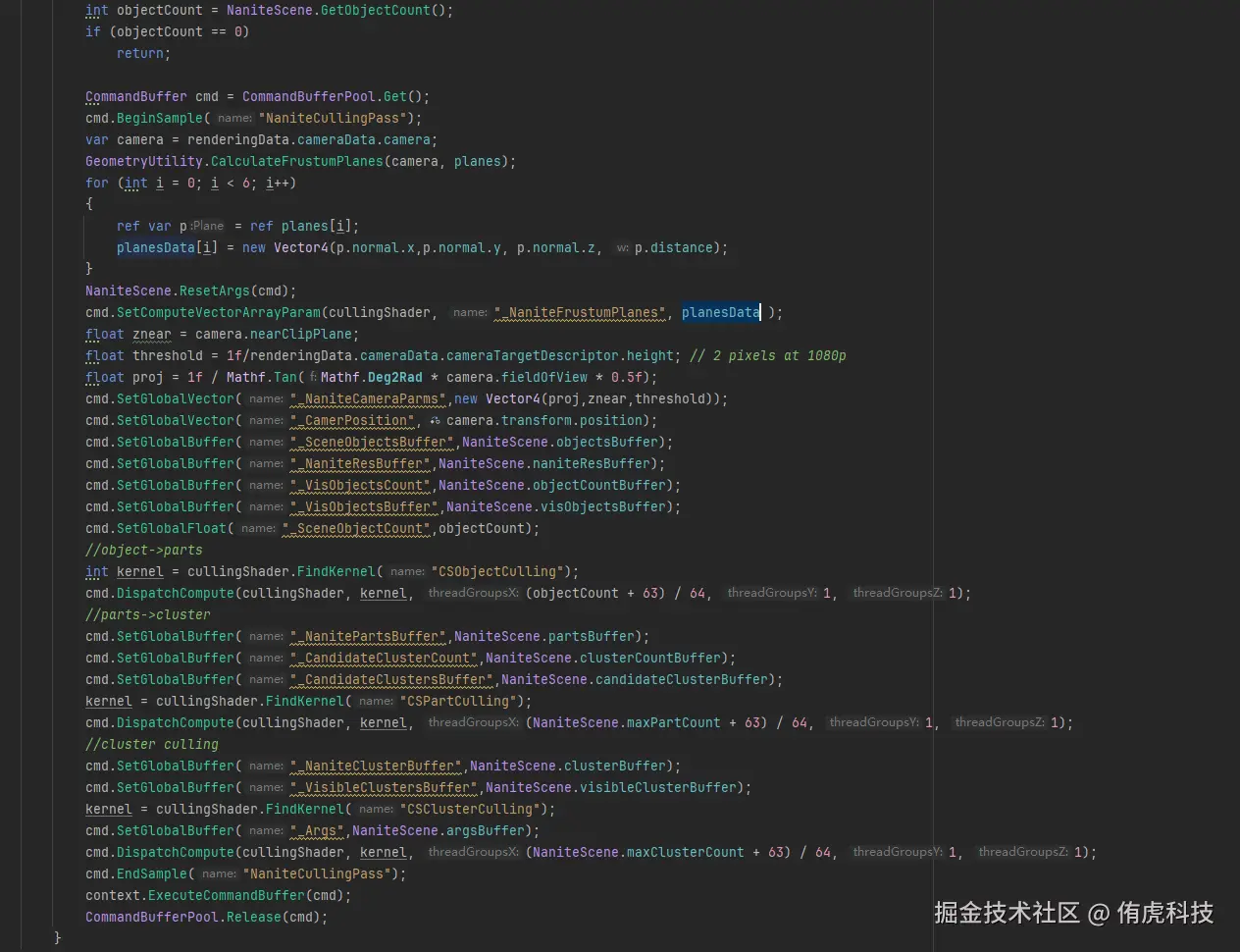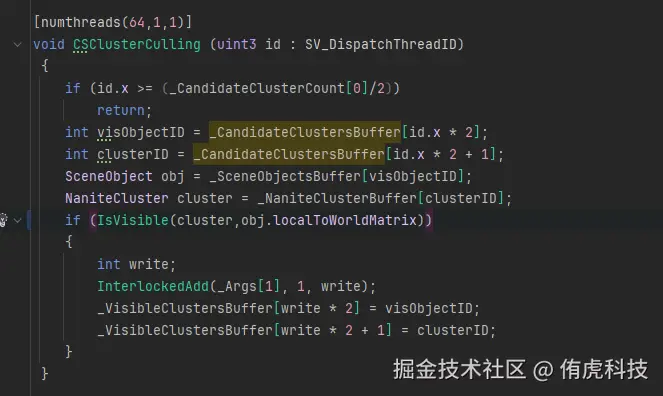 先从CPU发起剔除Compute Shader的Dispatch。这里因为组织数据时候就知道了所有Object最大的Parts/Cluster数量,所以直接用这个数去Dispatch了。