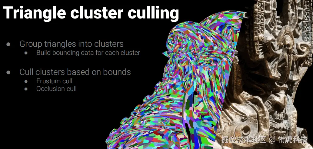 - Cluster Rendering:由Cluster组织三角形,可以享有更高效的剔除。