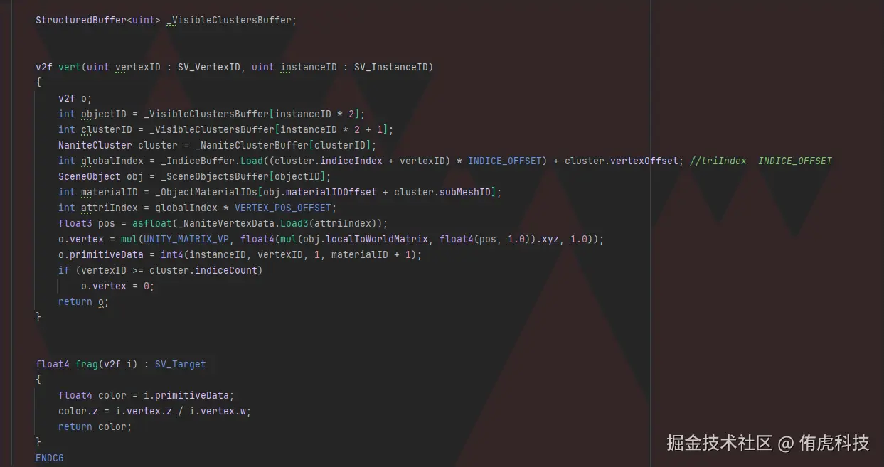 VBuffer主要用来减少Overdraw,着色器直接输出InstanceID、ClusterID、材质ID。然后用这个VBuffer来计算顶点数据来着色。