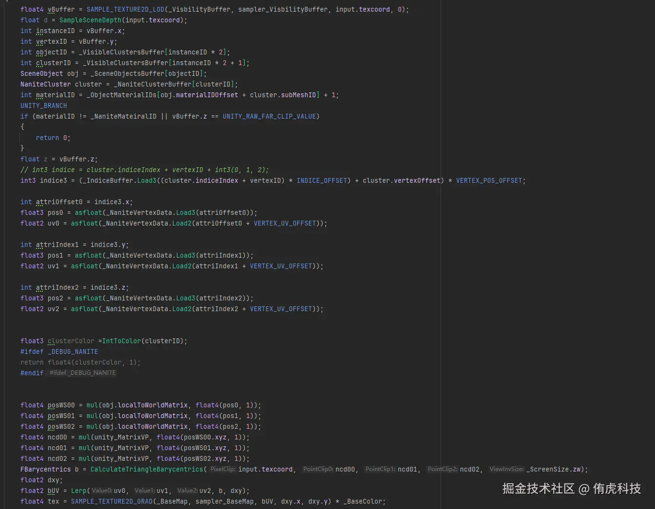 需要注意一下这里VBuffer通过三角重心插值求出的UV是不能直接采样贴图的,因为DDXY不对,所以需求重新计算,计算的代码放下面。并且利用SampleGrad(samplerName, coord2, dpdx, dpdy)来采样。