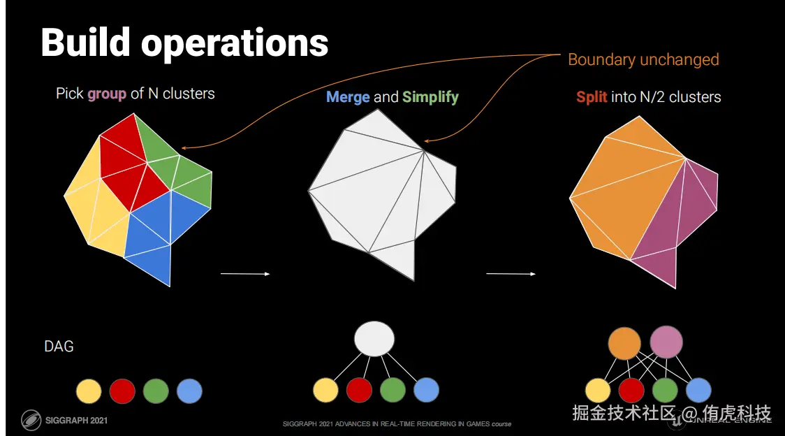 这个过程感觉就像Mipmap一样,一层一层往上合并和简化,并记录一个Err误差值和Bounds用于运行时LOD选择用。而这些合并的的节点就叫做Cluster Group。最后得出一个DAG(有向无环图,Directed Acyclic Graph)的结构。