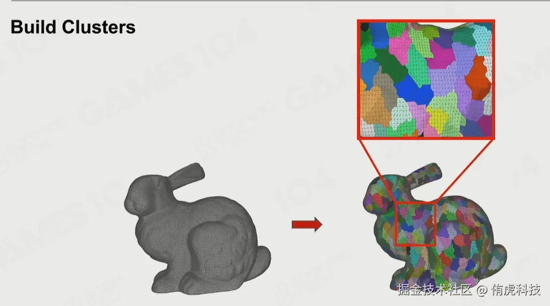 第一步,在离线阶段处理,将复杂的超高精度网格模型高效且合理地分割成更小、更易于管理的簇(Cluster),每个Cluster最多128个三角形。这种划分不是简单的切割,而是旨在最小化簇与簇之间连接的边数(即切割大小),同时保持每个簇的大小大致均衡。