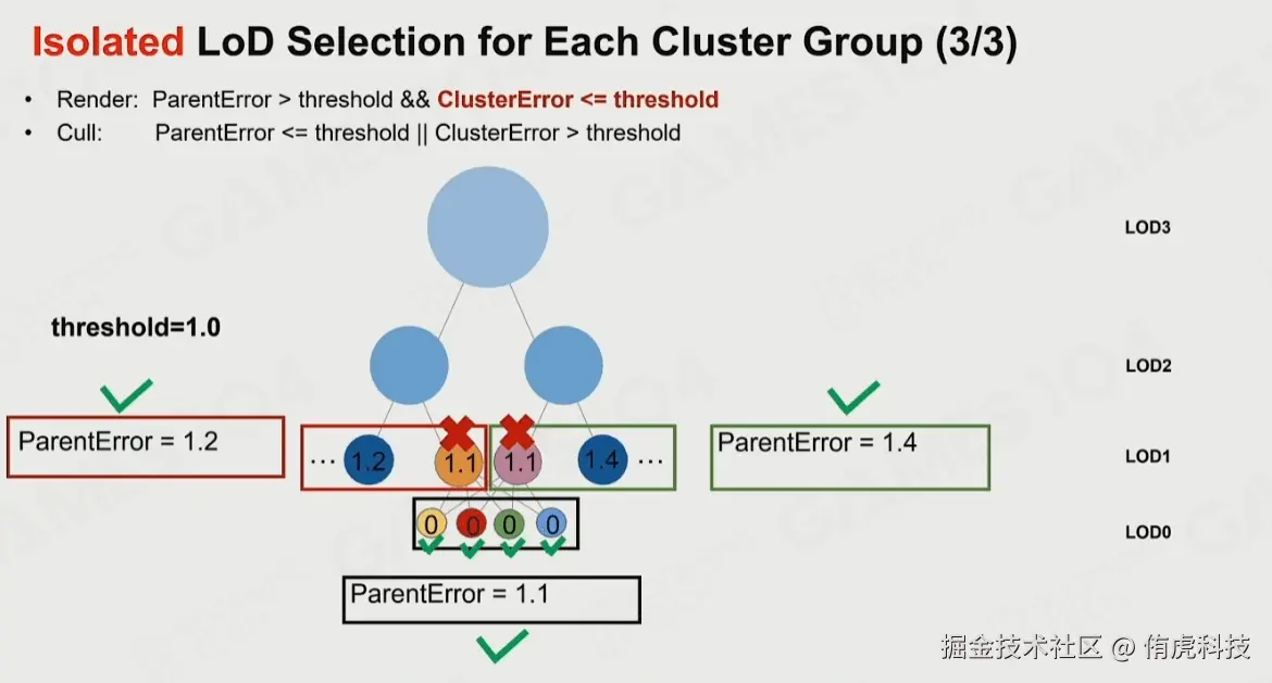 这时离线时候已经把Clusters扁平化到数组中了,这些Clusters是可以并行进行剔除的,巧妙之处是他记录了父级的误差和自己的误差,当我们传入误差系数时候就可以独立地判断自己是否被剔除,而和上下级无关。