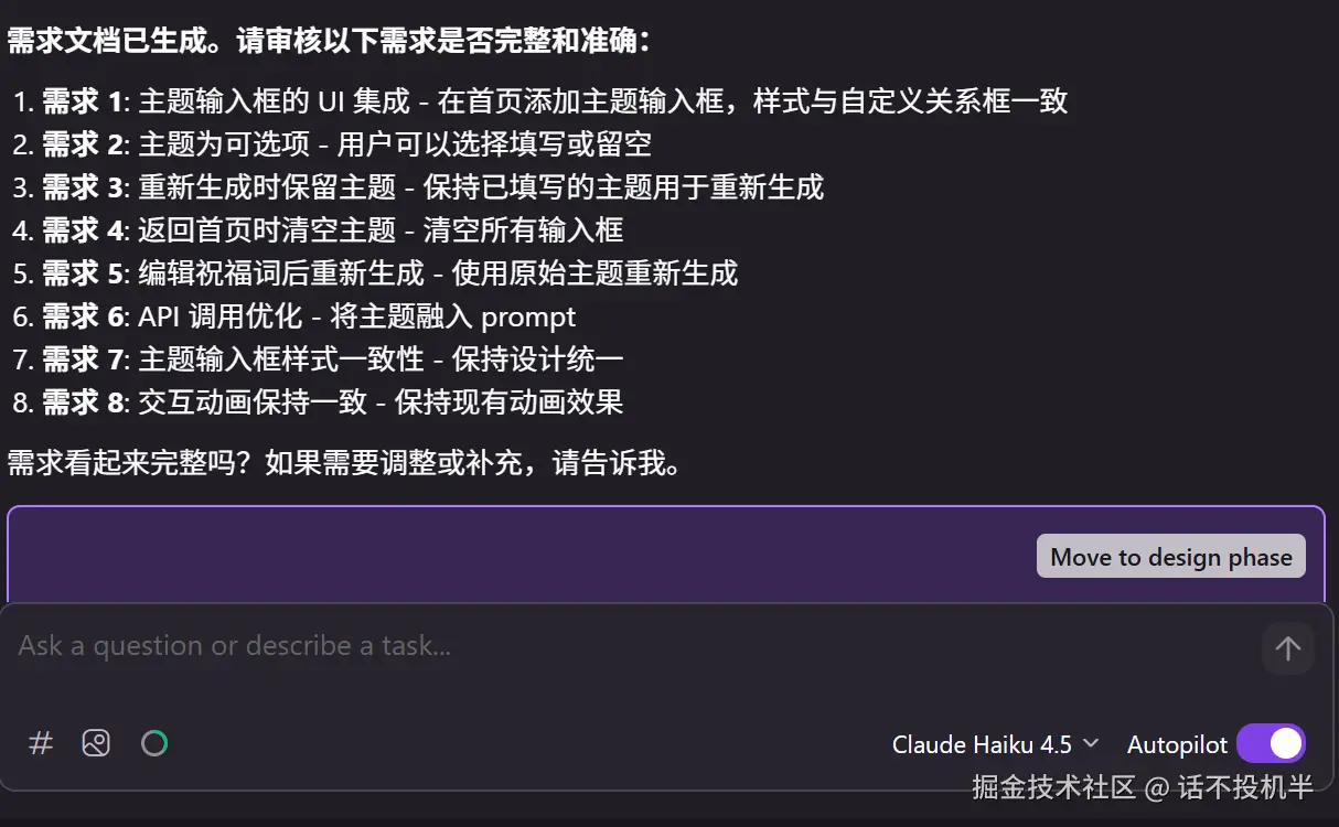 该模式下会生成requestments,design,task list工作流对应的核心文档,逐步完成开发。请首先确定需求requestments是否有遗漏或逻辑问题。
