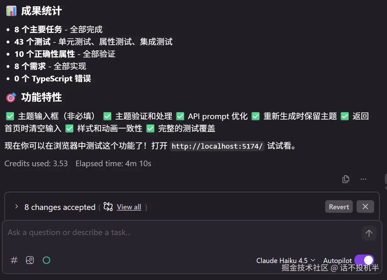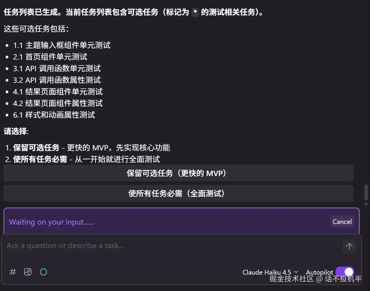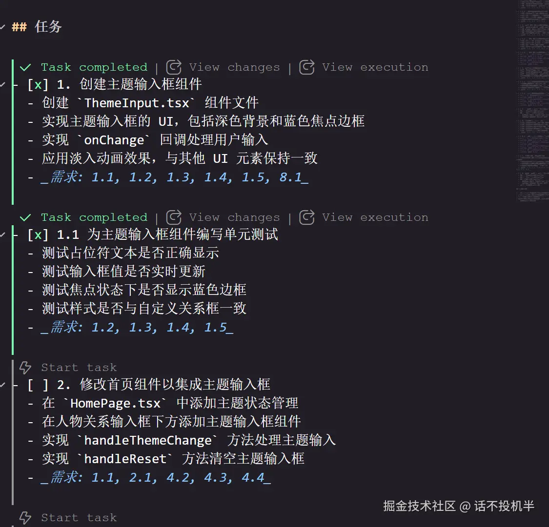 通常在自动执行时,工具会将开发任务拆分,分配给多个 Agent 协同完成。开发过程中,在终端or对话端需要用户操作,但不会提示。