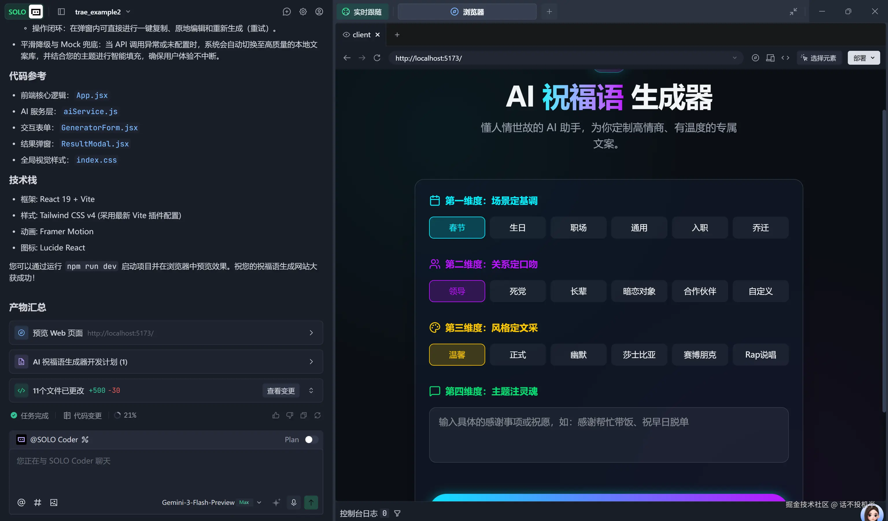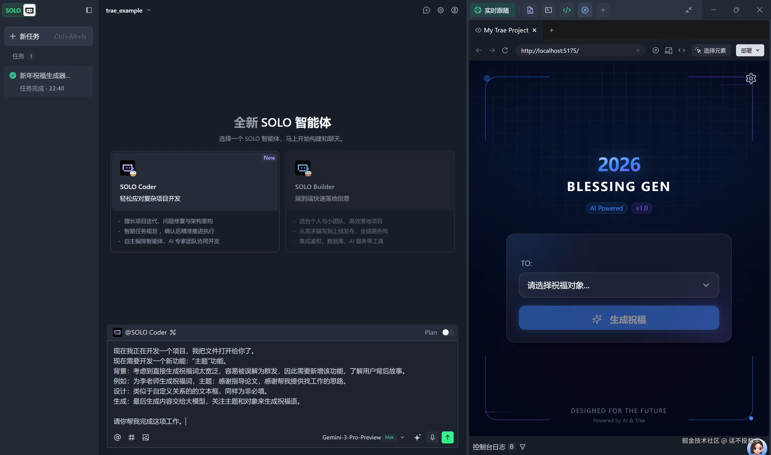 使用同样的提示词,交给builder。在solo模式,默认模型只有Gemini 3和kimi K2。此处使用Gemini 3 pro进行开发。