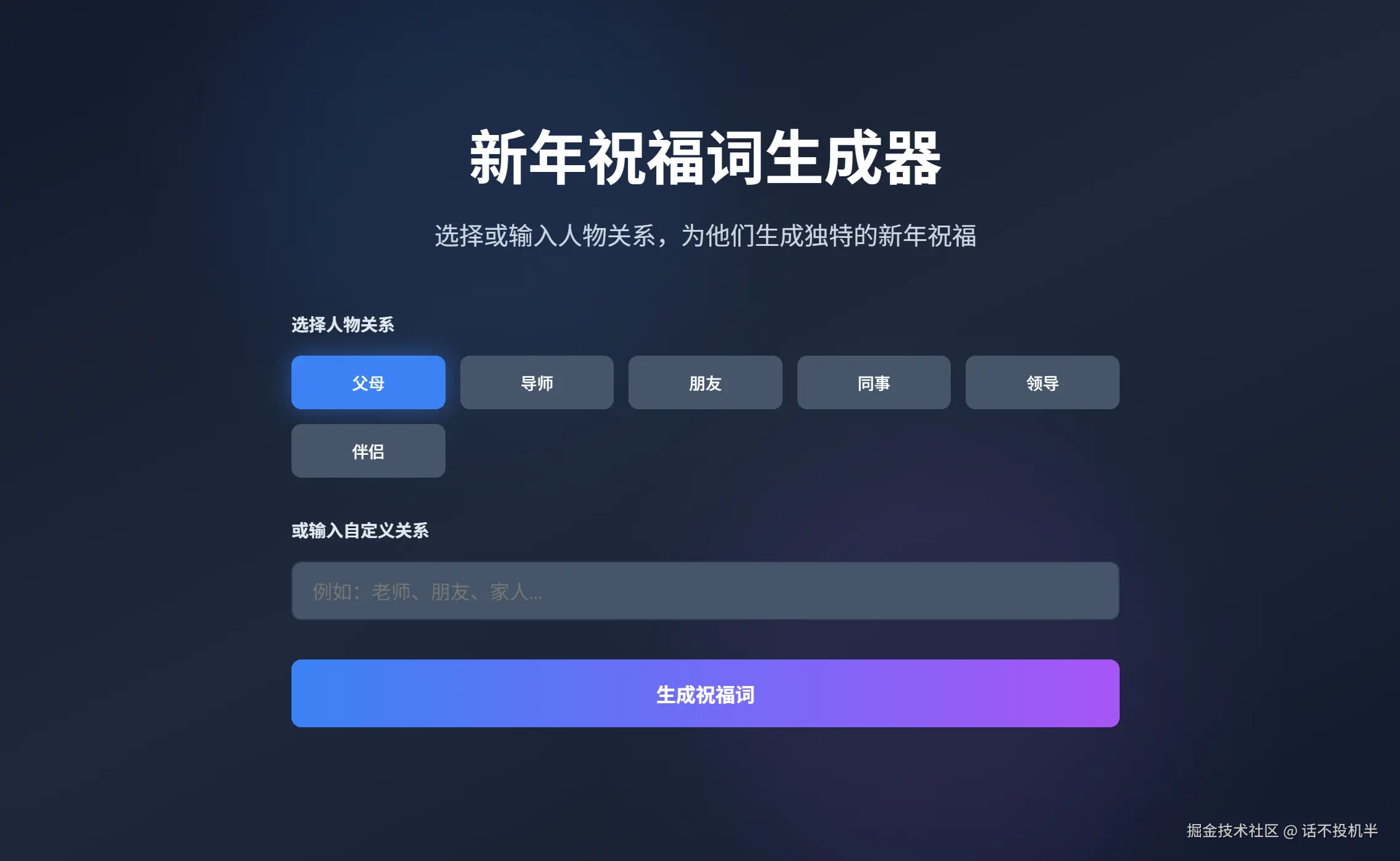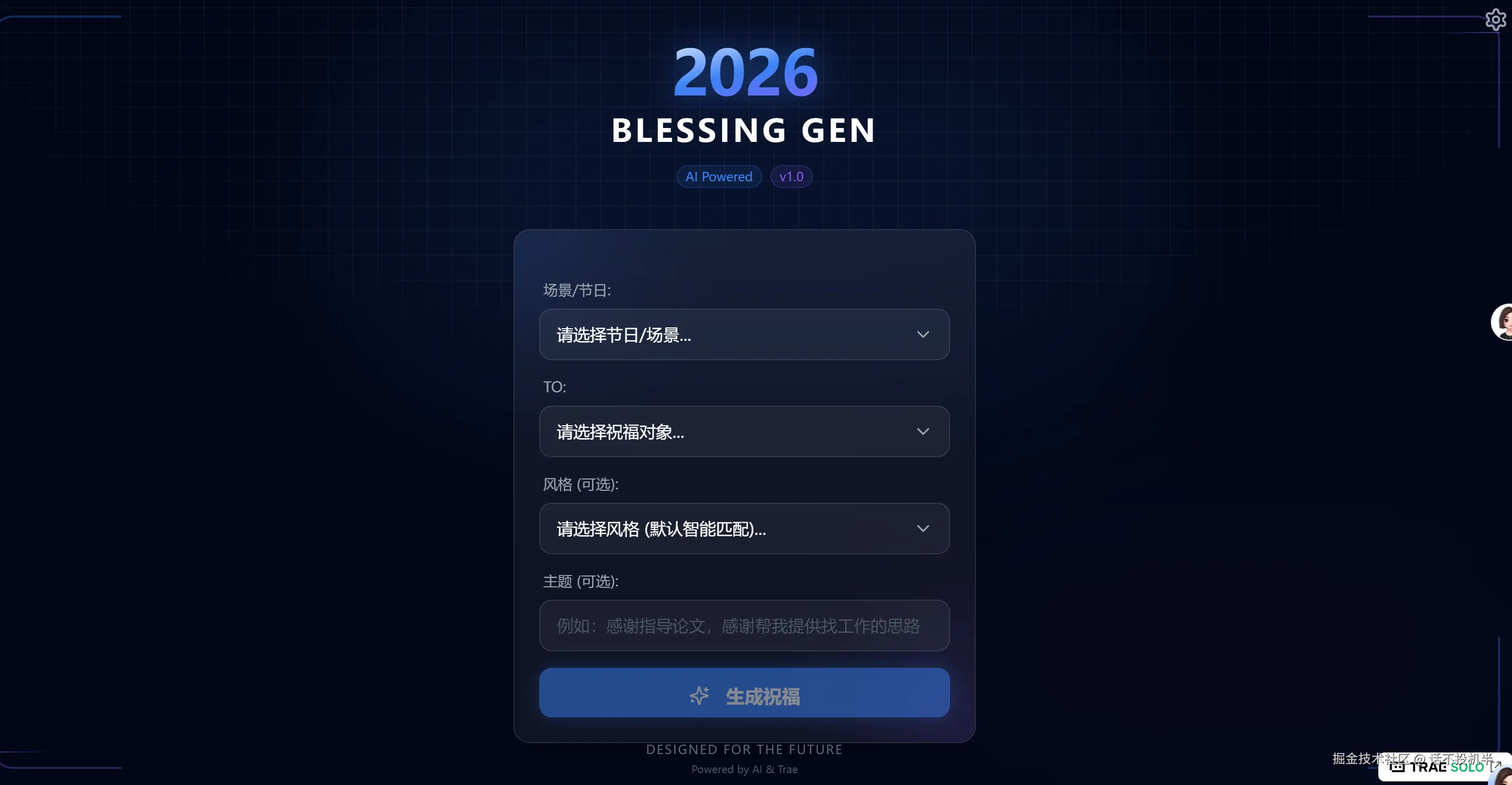 产品概述 本项目是一款基于 AI 的智能祝福语生成工具,旨在帮助用户在不同节日和社交场景下,快速创作出得体、个性化且富有文采的祝福内容。核心价值在于解决传统模板千篇一律的痛点,通过多维度的参数配置,让 AI 生成真正符合用户具体情境的专属文案。