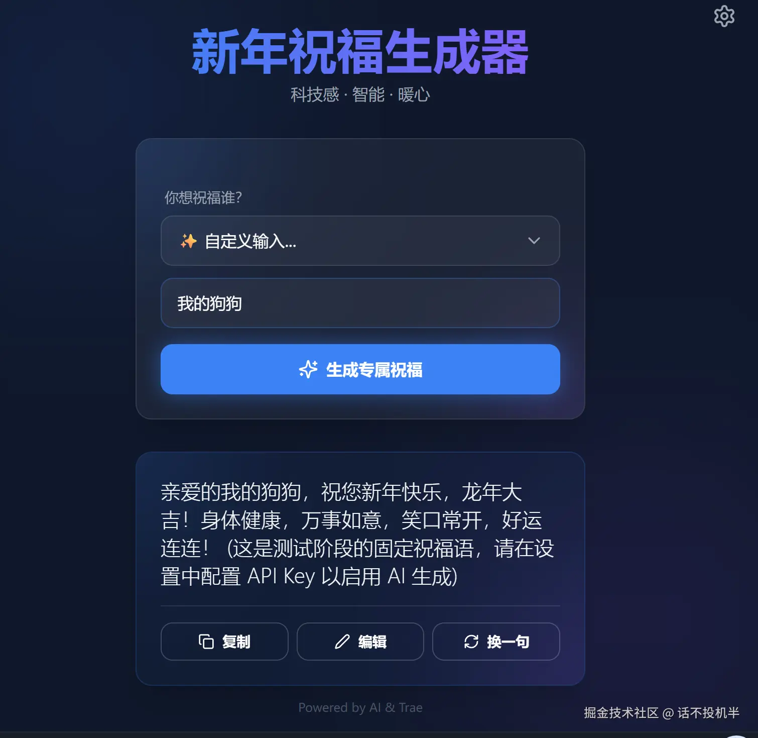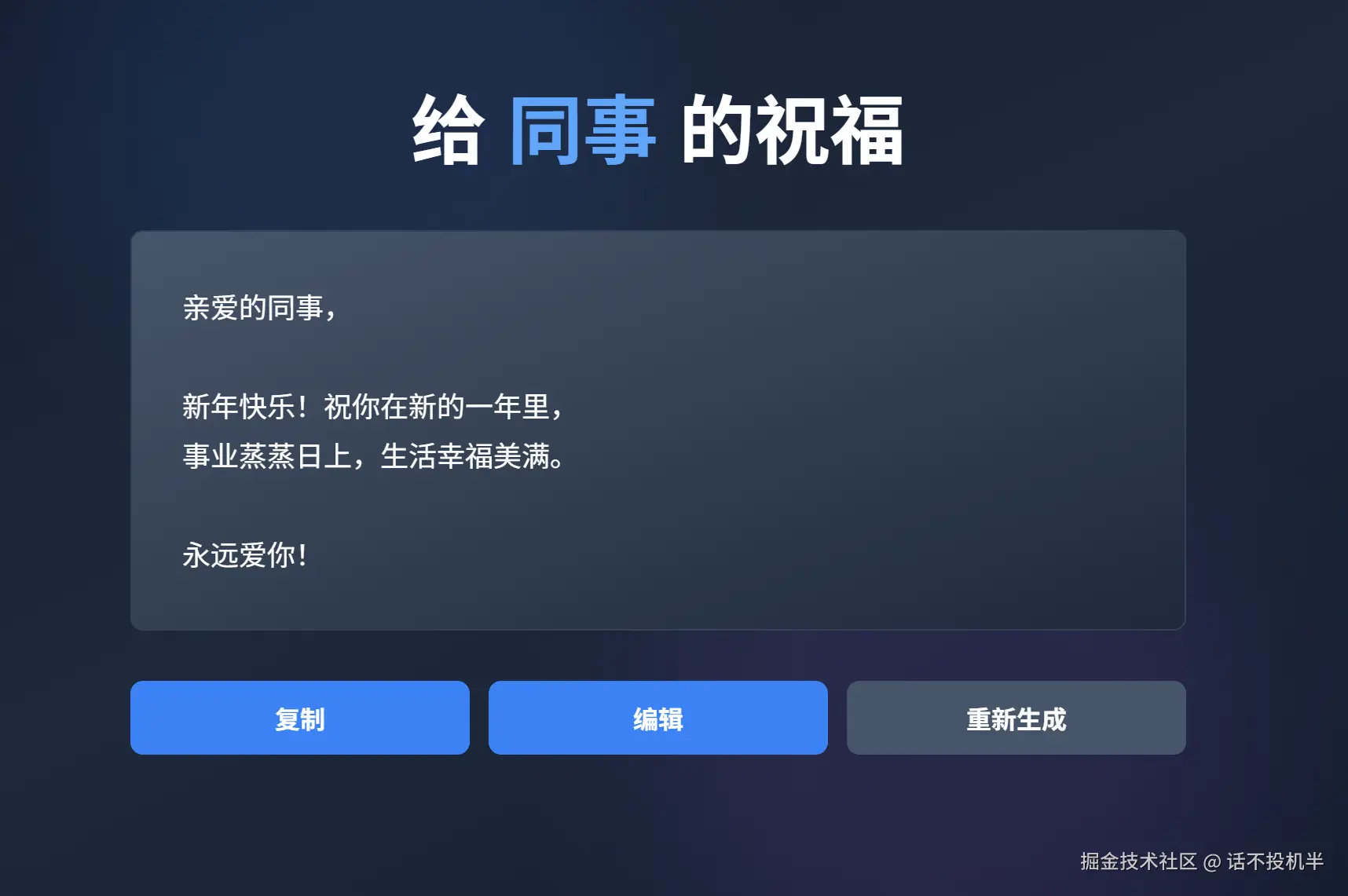 核心逻辑与功能 产品的交互逻辑围绕“四维配置”展开,用户依次确定四个关键参数:节日场景(如新年、生日,决定了 AI 的基础人设)、祝福对象(如父母、领导,决定了语气亲疏)、语言风格(如古风、幽默,决定了行文格调)以及具体主题(如“感谢提拔”,用于注入个性化背景)。前端将这些参数动态拼装成结构化的 Prompt 发送给大模型,确保生成内容精准命中用户需求。生成结果通过弹窗形式展示,支持打字机动效以增强交互感,并提供一键复制、二次编辑和重新生成功能,形成了从配置到获取再到优化的完整闭环。