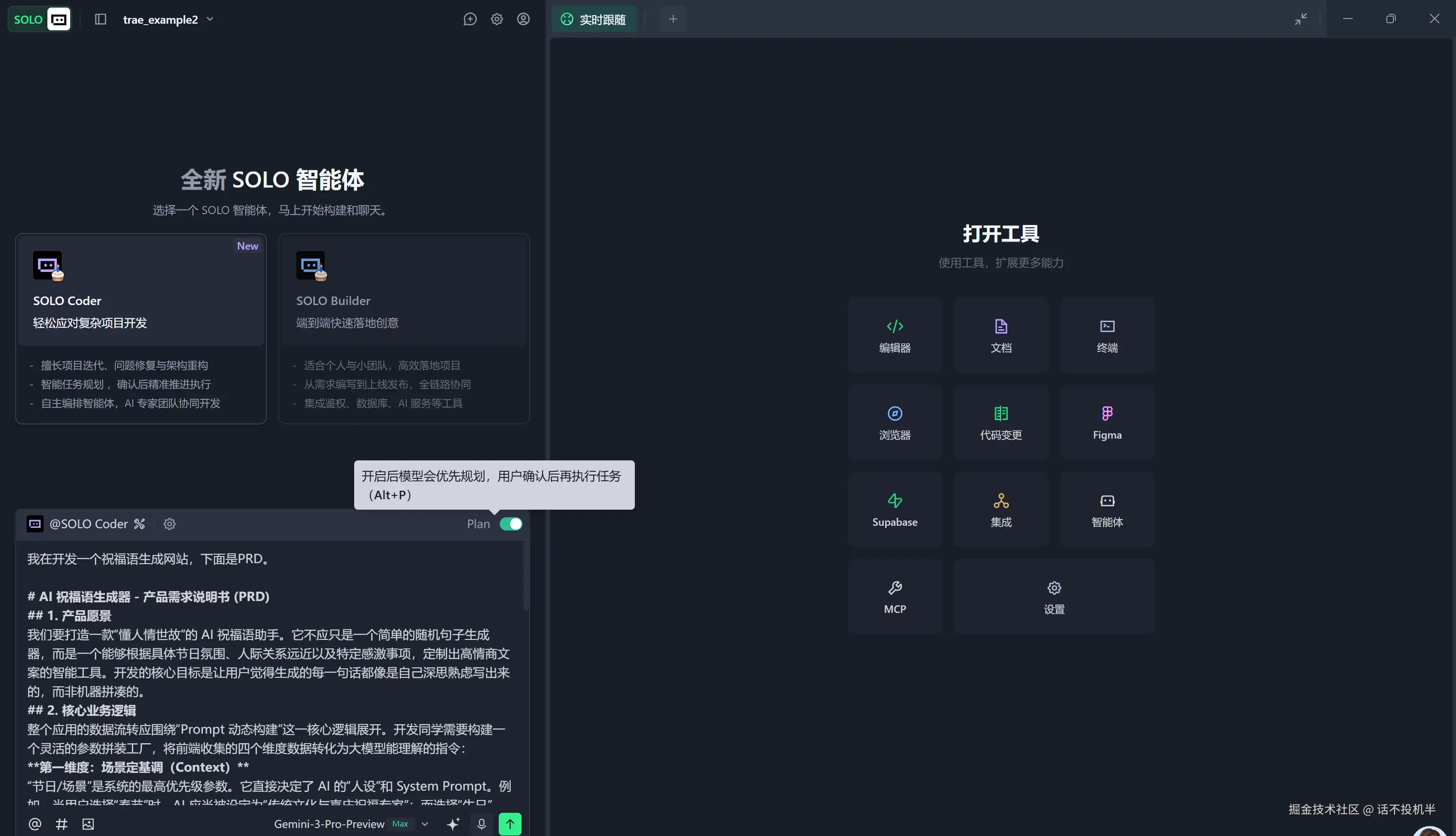 Coder 模式是 Trae Solo 的深度开发模式,开启plan功能后,将展现与 Builder 模式的核心差异。