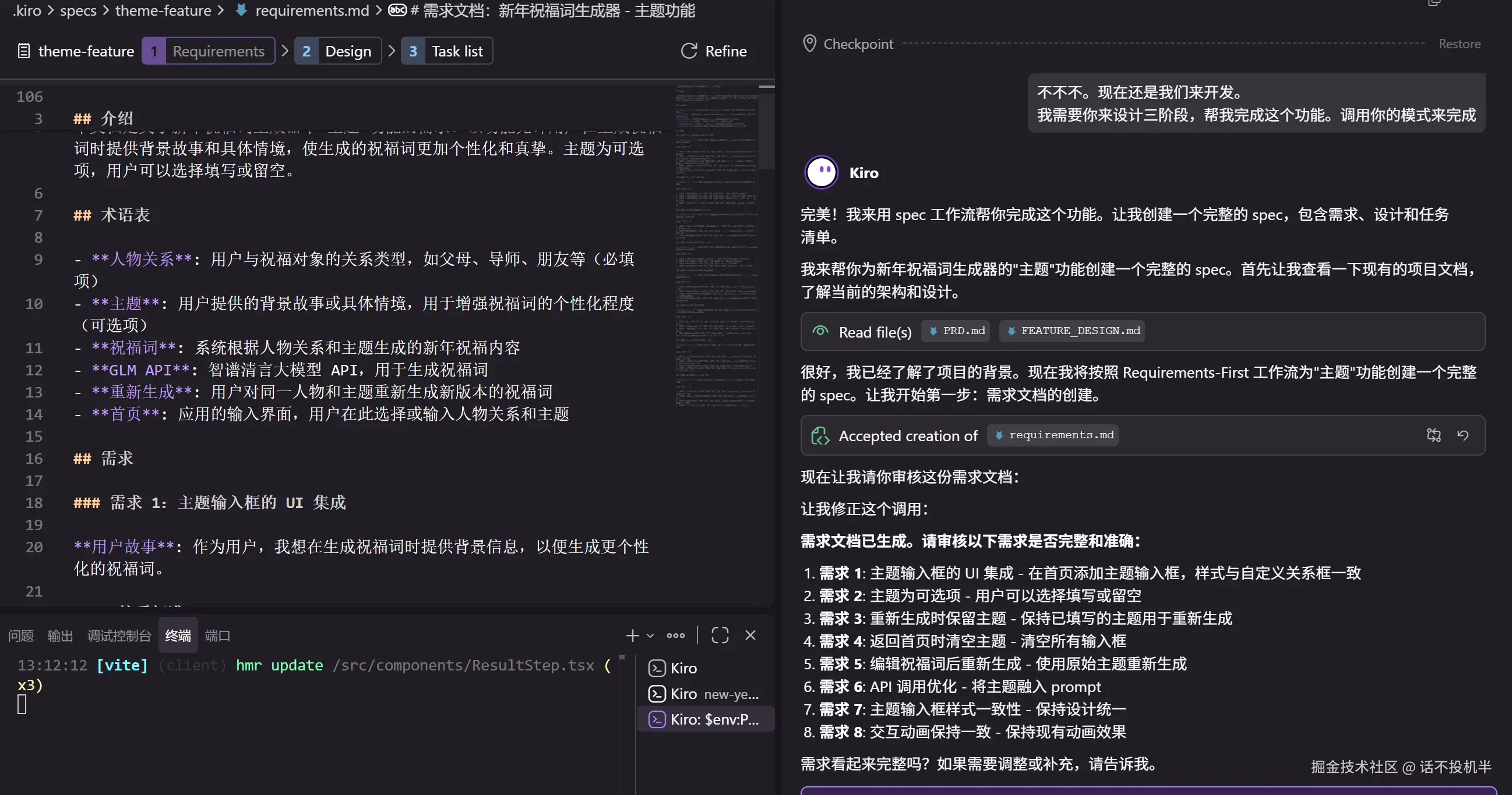 除了继承 Vibe 模式成果,Spec 模式也支持直接导入 PRD启动开发。在本节,我们首先使用上一节开发的网站,用kiro生成相应的PRD。随后复制给spac coding直接开发。后续流程同继承式开发。