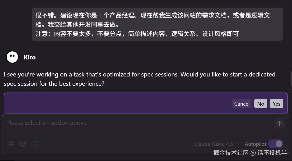 字节真的在把用户当作0基础,秉持 “零基础友好” 的理念,致力于实现Vibe coding;而亚马逊出品的 Kiro 直接给出vibe coding模式,结合工程化严谨开发的范式,更受到技术背景产品经理的青睐。
