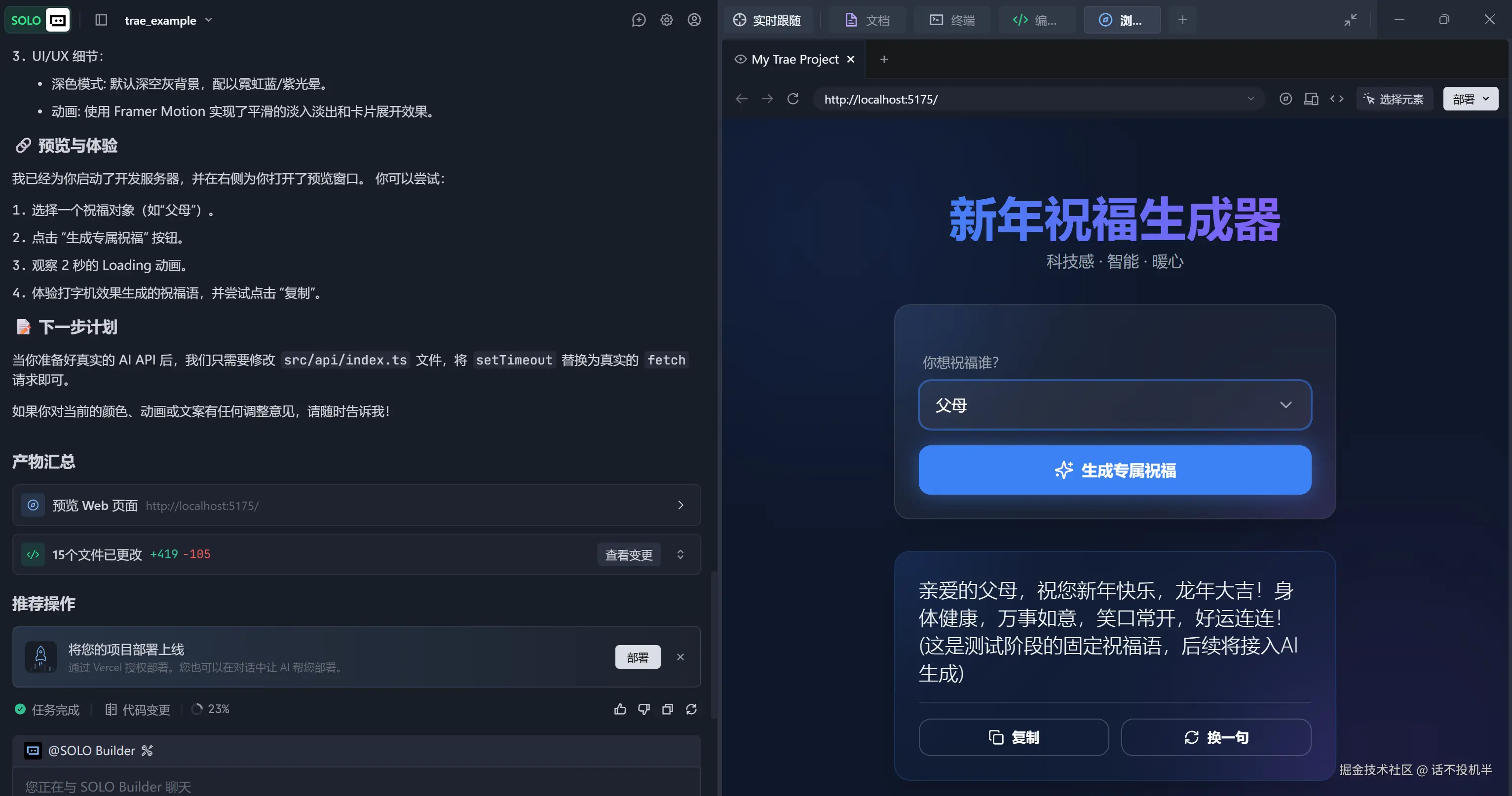 trae生成网址后会给出预览,并默认vercel部署选项。在应用拓展的便捷性比kiro做的好一些。全程托管对于懒人来说省事很多。而且经过多次生成对比,trae生成页面的风格、颜值确实(可能)要高一些。