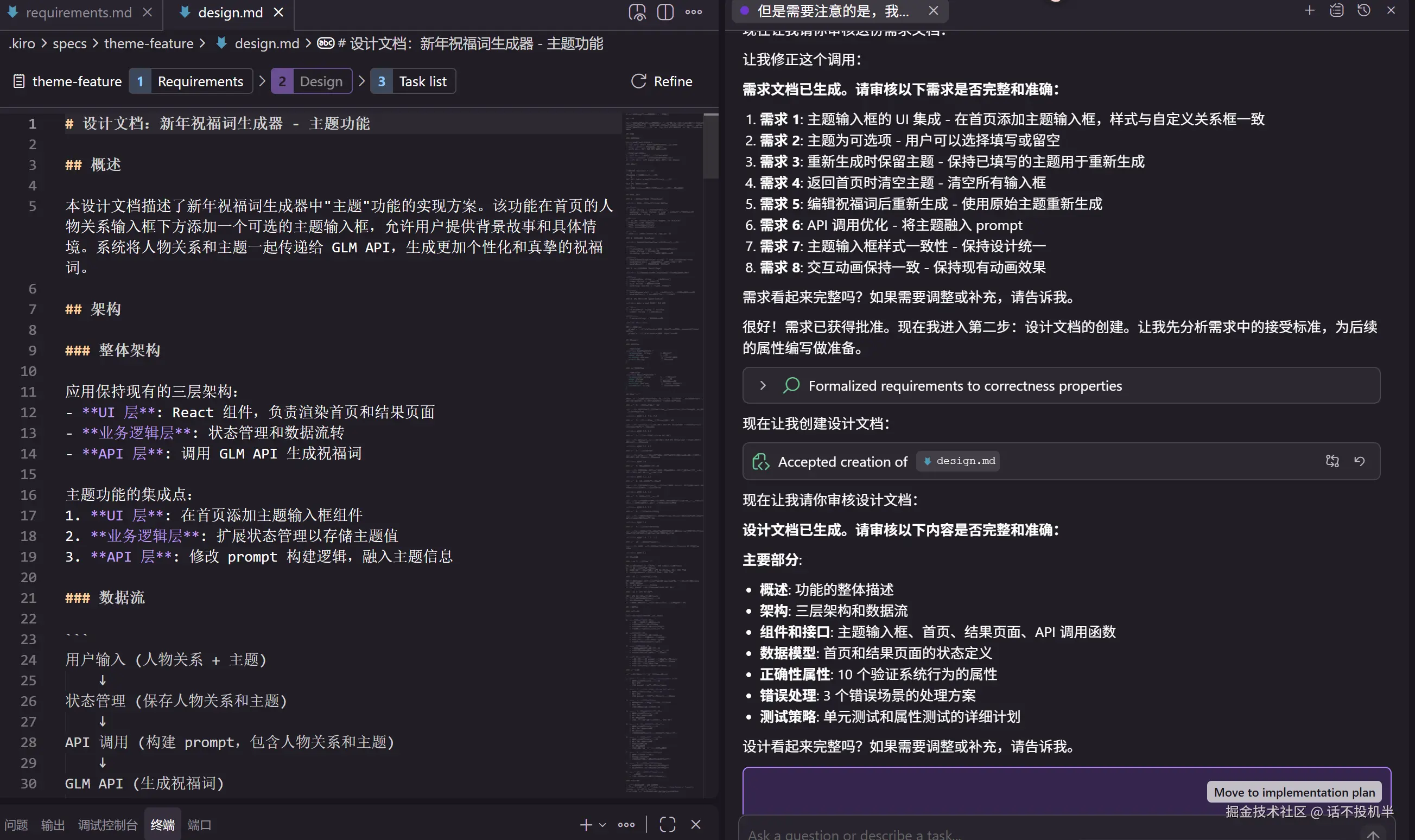 - Spec 模式需先明确规范,输入需要更加完善。包括页面有什么,逻辑关系等等。甚至直接把vibe开发的项目包丢进去。随后spac模式会通过结构化文档固化需求、设计和任务,再推进开发。