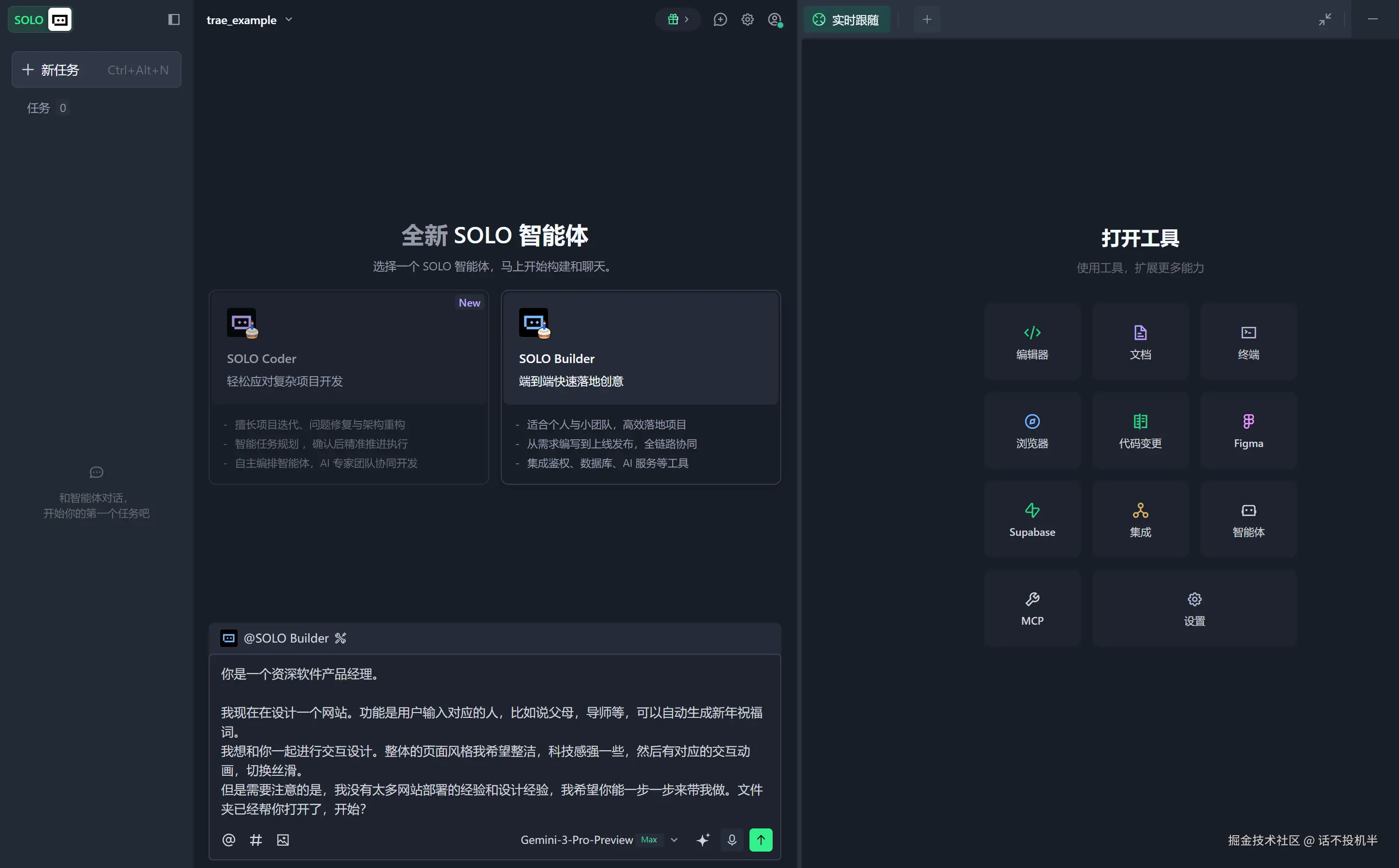 界面左侧为任务栏,更像是常见的大模型对话模式,可开启多个任务。智能体布局在中间,表明了其“ai主导”的决心。右上角的实时跟随可以透明化看到trae在编辑哪些文档。