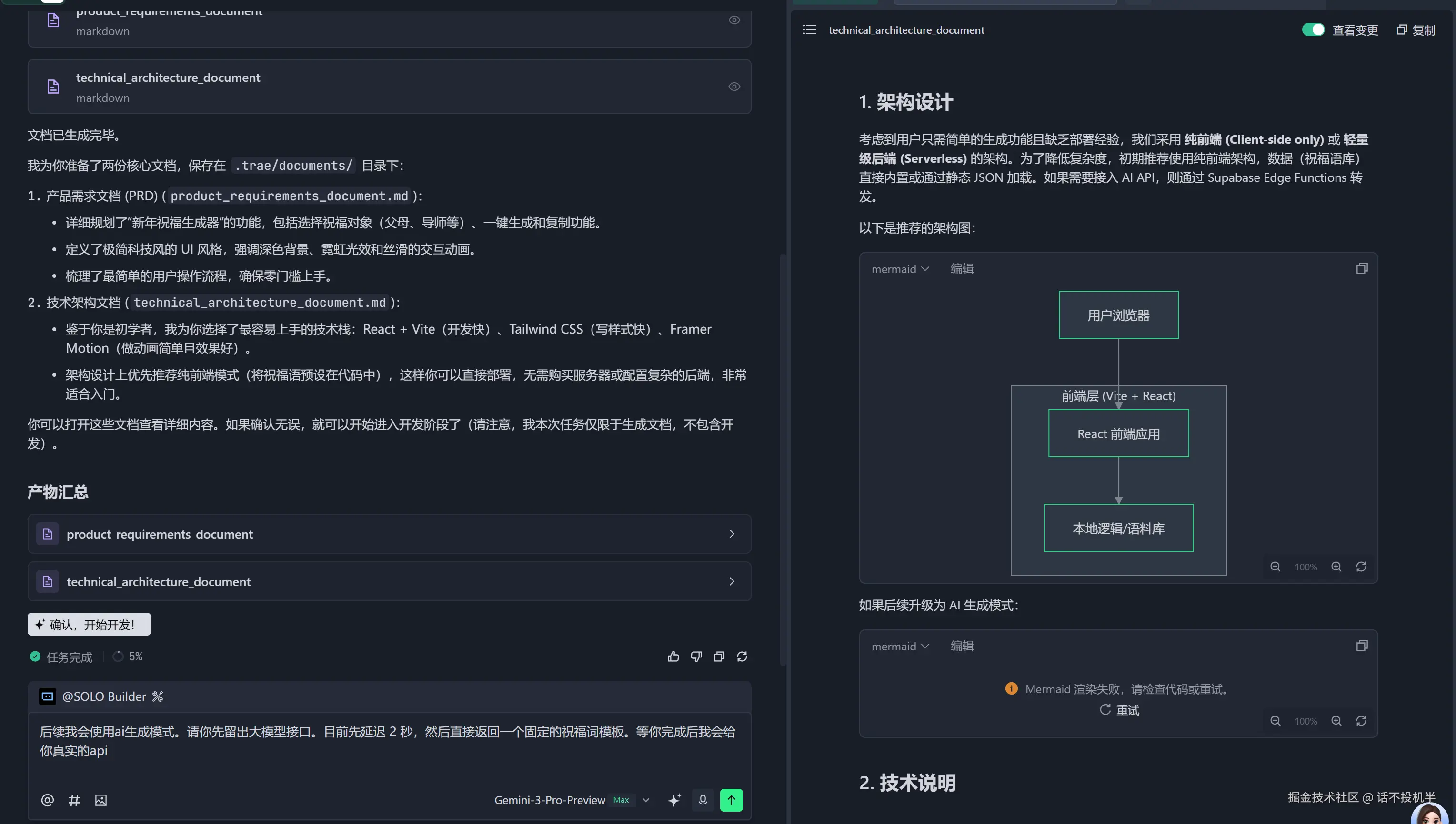 | 轻量模式 | Vibe:快速对话式编码,无强制文档,适合原型 / 探索 / 小改,自由灵活 | SOLO Builder:自然语言→自动选模型→生成 PRD→出可预览成果,一键部署,面向快速落地 |